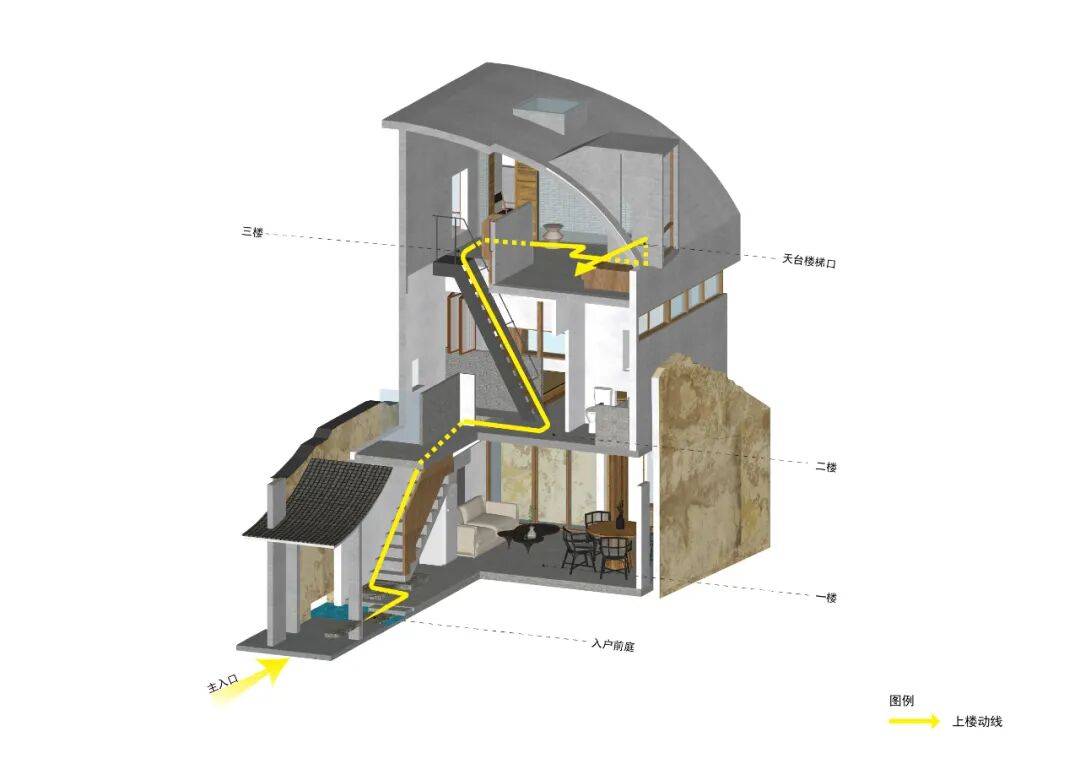 “学背之家”历时近五年的营造,是一次从物质性的“故土”迈向精神性“原乡”的漫长旅程。使用“时间剖碎”与 “现象的透明性” 策略,在垂直维度上重构了空间的深度与层次,将物理的“微缩”转化为感知的“旷奥”;通过“呼吸建构”与自然交融;更通过对“爬梯”、“中心柱”、“谷仓”“园池”等空间原型的当代转译,直指家的精神内核,对商品住宅所导致的家族观念与居住意义的扁平化进行了深度的空间反思。