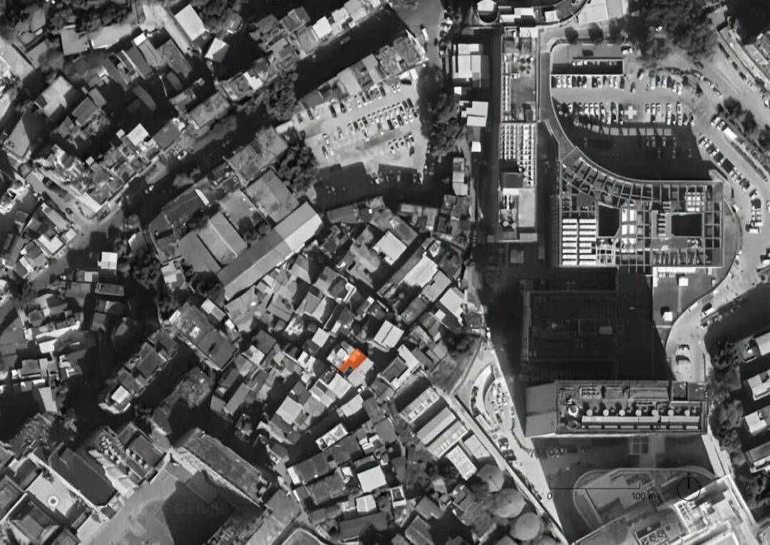 宅地位于不同年代建筑围合的街巷之中,是父辈兄弟分家析产残留的地块,地块呈不规则的P字形,经测算,剔除老墙基后,净面积仅44平方米。东、南两侧与邻宅共用山墙,西面仅40CM墙距的巷隙两端被砖墙封死,形成一个近乎密闭的“缝隙空间”。南北方向虽略有开口,但南侧巷路狭窄和婶婶家凸出一块房角,把唯一出入口挤成1.9 x4.7 米与 5 x7 米的“P”字形地块,北侧85CM间距被低矮铁皮房半遮挡。这种四面围合的“P”式格局,给采光、通风、视野和施工带来了极大的挑战。