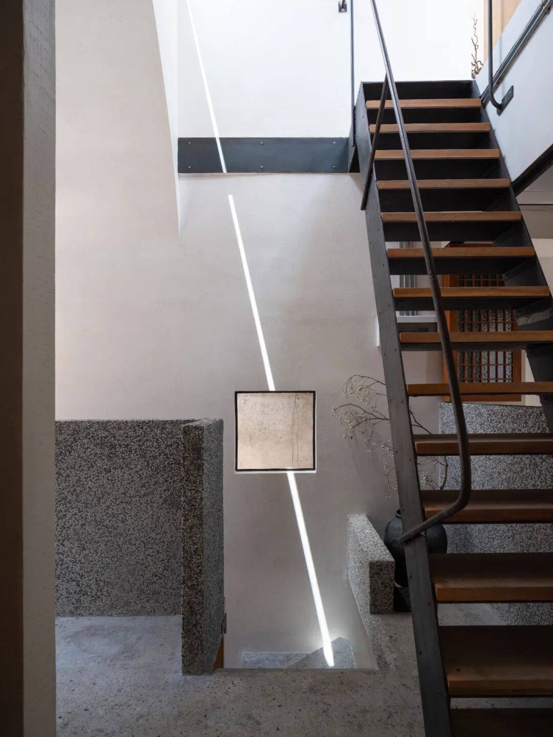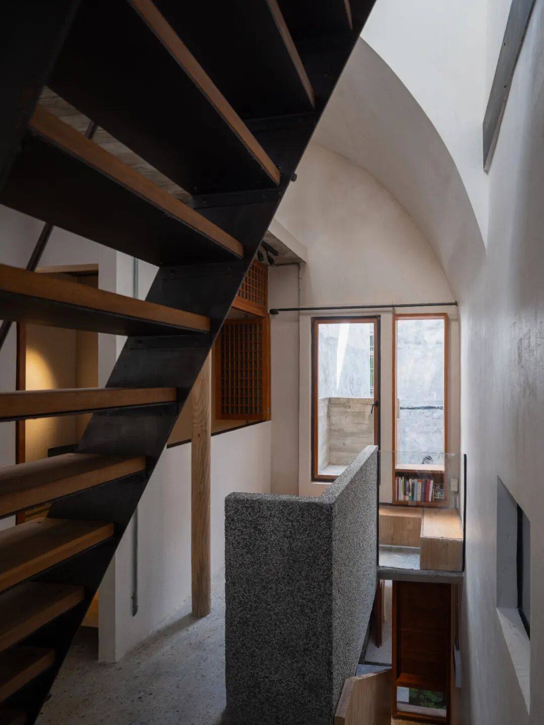 我们设计了通往三层耕读空间的楼梯,其坡度与宽度65厘米刻意回归了老城窄梯的尺度,需“手抓护栏,一人上下”。这种受限的、具有明确身体性的攀爬过程,与商品住宅中宽大、流畅、高效流通的楼梯形成了鲜明对比。