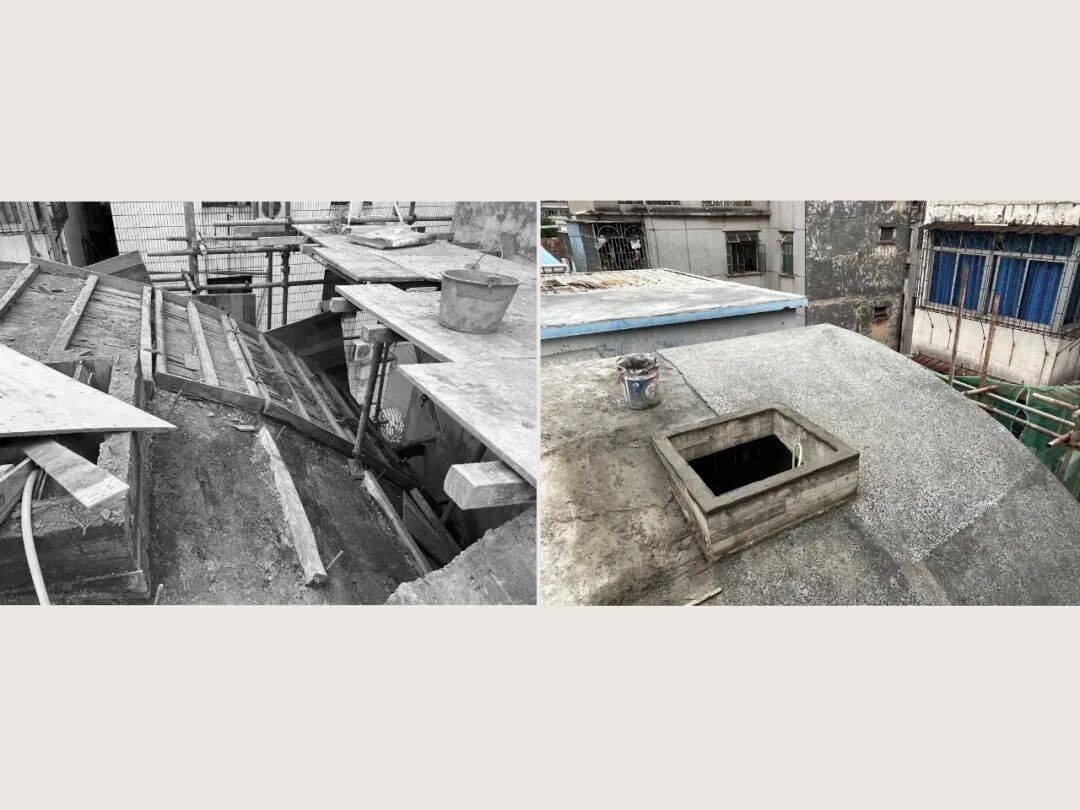 ▲大弧顶拆模(左)与补救施工(右) @共和营造