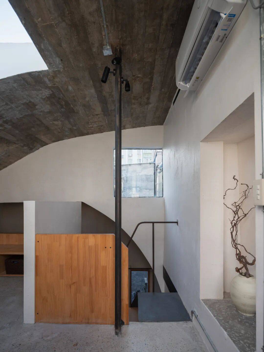 为化解东西高墙的压迫,屋顶被设计成一道舒缓的弧形。这道弧线不仅从视觉上消解四方盒子的僵直感,赋予混凝土屋顶以轻盈的意向,更是引导视线与空间体验。大上扬,所见的天弧顶向外张弓,消解内部压迫感;人置身于三层弧顶之下,坐卧在特意设置的罗汉床榻上,视线随弧面自然空片段因而显得更为深远,立足外部阳台又实现了“棚下看雨”的诗意。