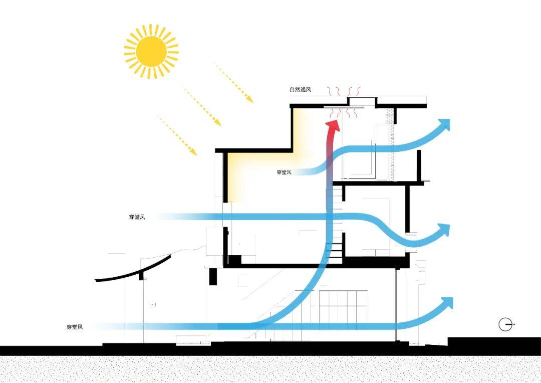 岭南地区气候闷热潮湿,良好的通风是舒适居住的前提。 我们设计了一套精细的被动式通风策略。首先,利用南北向的开口组织穿堂风。其次,在一楼地脚设置隐蔽的进气格栅,在三楼屋顶预留排气风口,利用热空气上升的“烟囱效应”,即使在无风或门窗关闭时,也能形成持续的气流,将室内浊热空气抽出,引入底部凉爽空气。这套系统确保了建筑能够“自主呼吸”。