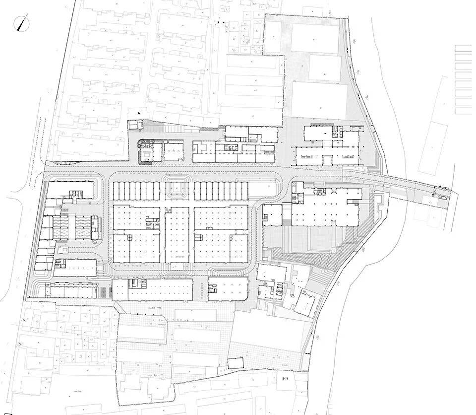 灵岩南路是整个厂区唯一与城市街道相接驳的界面,街巷尺度不大,生活气息浓郁,而现状沿街人行空间逼仄、建筑界面封闭;因而优化街巷尺度,将建筑界面打开,让人“进的来”“留得住”成为了设计首要考量的要素。我们尝试重新梳理沿街的建筑界面,通过建筑界面的适当退后与檐廊空间的设计缓解人行道尺度狭窄的空间问题,同时通过玻璃界面与清水砖墙相间隔的材质运用增强首层商业空间的公共性,厂区东临杨思港,是一组更具有趣味性的水岸界面,通过恒大桥链接到上南路上,这种得天独厚的地理特征为厂区提供了约300m长的滨水岸线资源。整合滨水资源,将滨水景观渗透到场地当中去也成为设计的一种愿景。在总体景观设计中,我们梳理贯通了东侧的滨水慢跑道,并梳理开放出一处约1200平方米的公共活动广场与滨水慢行道相联系。