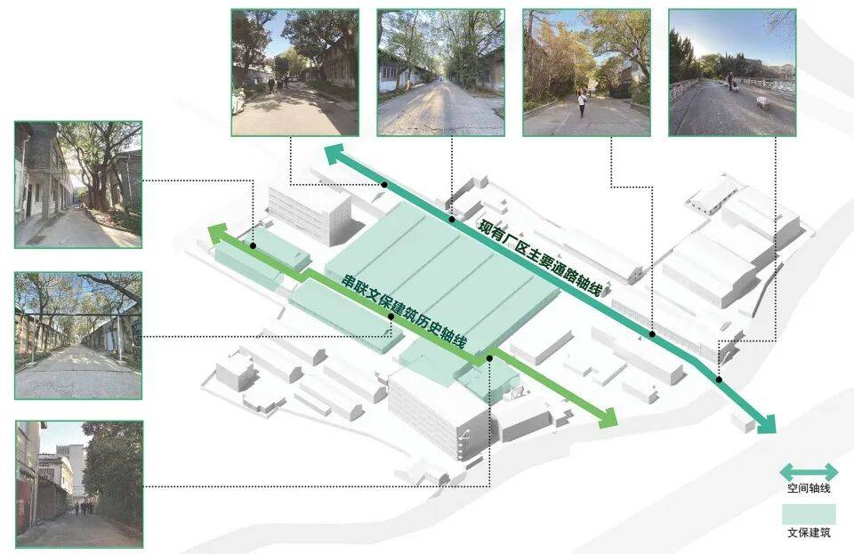 厂区内标志性的景观大道经梳理被我们打造成为一条重要的现代商业轴线。厂区南侧腹地进深较深,缺乏次级路径的带动,亟待路径织补。我们通过拆除部分风貌价值较低、结构安全性较弱以及经研判为后期加建的建筑体量后,梳理打通了靠近场地南侧的部分路径,这条路径刚好由灵岩南路南侧作为起始点,串联起五栋文保建筑,我们将其梳理打造为历史体验轴线。漫步于这条历史街巷之中,两侧保留修缮的历史建筑同街巷空间一起,共同传承了百年纱厂的空间记忆。而这条脉络的疏通也使得靠近腹地东南侧的原有大礼堂建筑更加公共可达,其特征性的山花立面成为这条历史街巷的对景,与保留的水塔构筑物共同作为轴线的收止点。