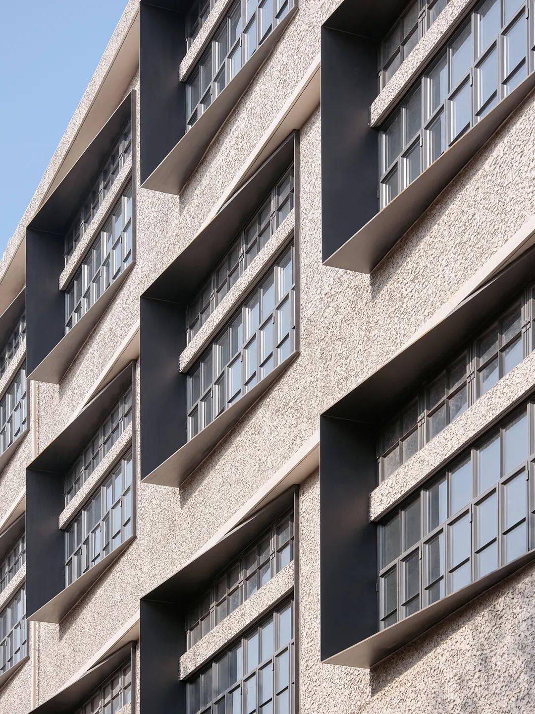 对于建筑品质不佳的既有建筑,我们将通过拆除并新建的策略进一步丰富 场地内建筑形式的多样性。如主体厂房东侧的一组既有建筑风貌不佳且结构安全性较弱,结合园区对公共空间的诉求以及后续办公功能的诉求,我们采用拆除原有零散建筑,新建一栋五层办公楼的策略进行该区域的更新。我们从场地内既有建筑形制溯源,以新的方式呈现时间与空间的剖断面,将均质密梁的结构形式外化,形成朝不同方向出挑的层板,以作为对场地南侧水塔广场以及东侧杨思港多向景观的回应。在水塔广场,经由景观台阶拾级而上,即可到达各层景观平台,而这条路径继续向上又以外化的形式作为办公楼建筑的西立面呈现,在历史轴线的转角处远望,这座建筑并非孤立的存在,而是由地面的景观逐级生长起来的。