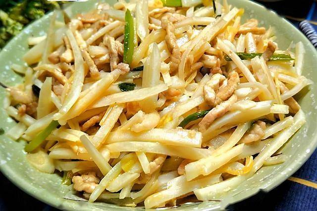 - 爽脆搭配:藕丝泡水防黑,白醋快炒保脆,肉丝嫩滑适口。