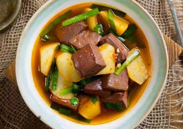 3.加入鸡汤、白萝卜、生抽及黑糖煮20分钟,煮至白萝卜变软,加入猪血煮10分钟,加入老抽、胡椒粉及韭菜煮沸。即成。