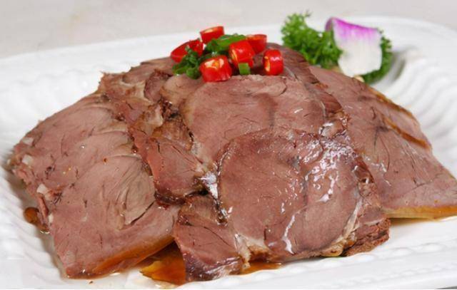 1、将牛腱子肉洗净,漂去血水,用沸水烫—次,放 锅中,加清水淹没,置旺火上烧沸,撇去浮沫,加黄酒、八角、姜块、葱段、精盐,盖严盖,移至小火上煮至酥烂,以筷子可以戳穿为好,端下锅晾凉,取出牛肉。