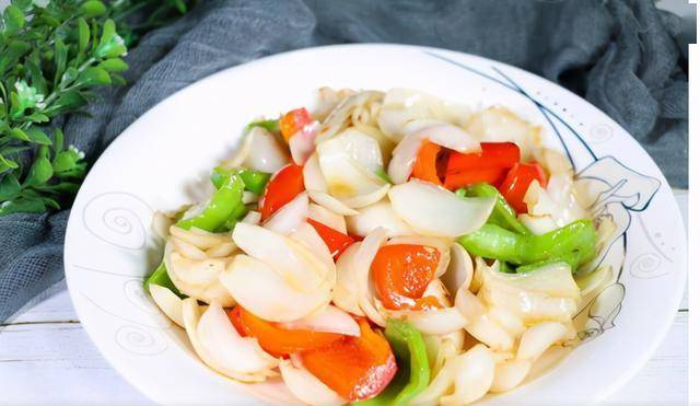 3.最后倒入切好的蒜片和青红辣椒,继续翻炒2分钟,放盐调味后即可出锅。