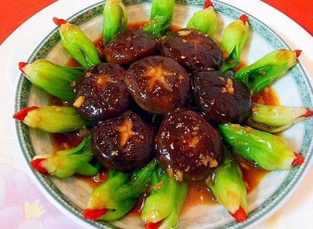 做好的象征吉星高照寓意的七个香菇摆在有油菜上,再浇上汤汁,亮丽登场!