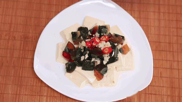 ④将酱汁淋到皮蛋豆腐上即可食用。