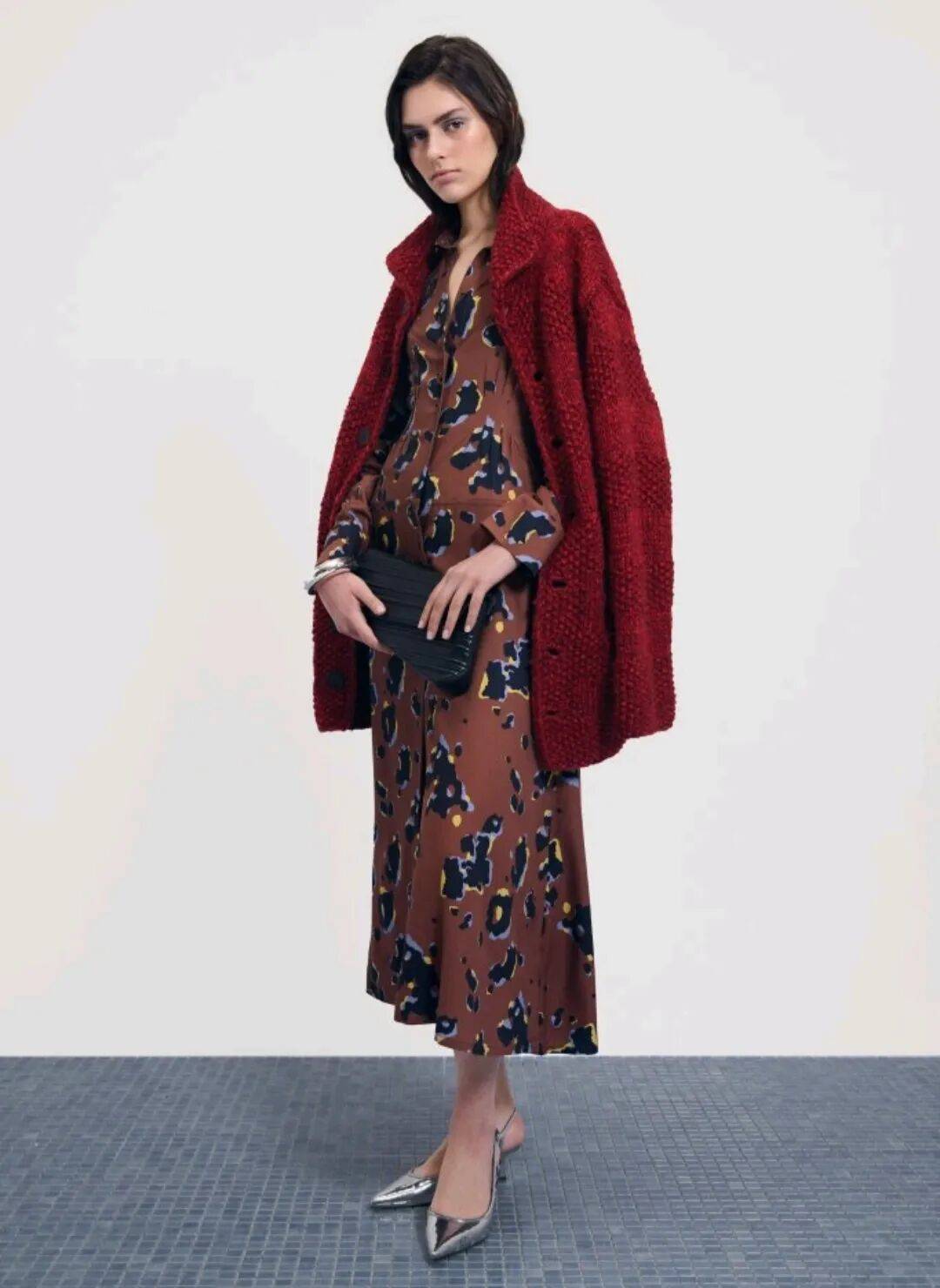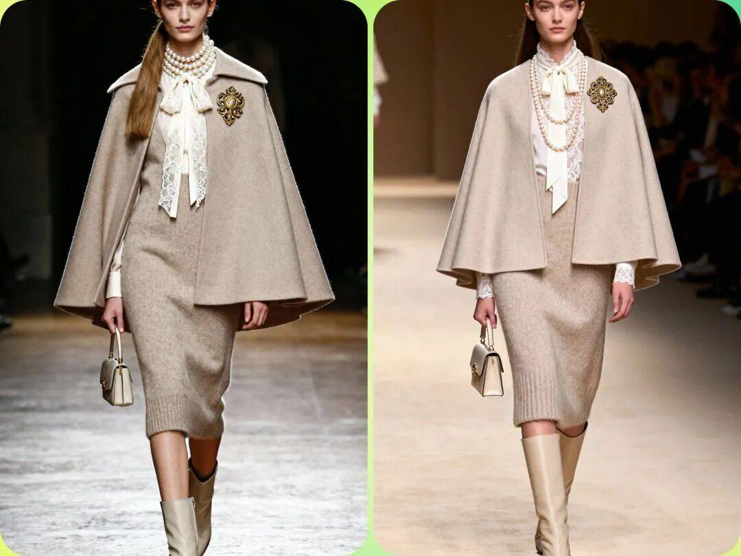 灰粉色调的羊绒围巾,勃艮第红的手拿包,