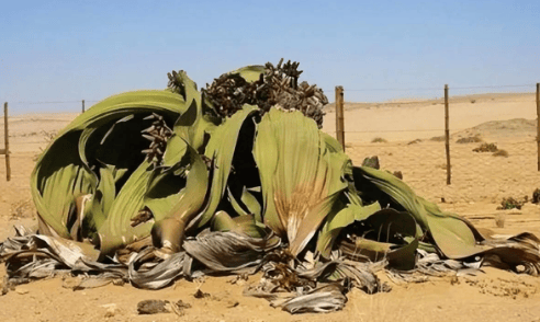 百岁兰,原产于非洲纳米比亚沙漠,树干矮短且粗壮,高度不超过50厘米,呈倒圆锥状,能够在沙漠固沙保土,也是世界上永不落叶的珍稀植物。
