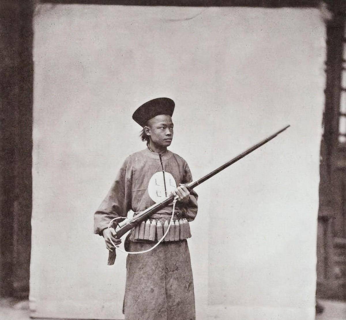 照片中的清军士兵,手持西式洋枪,眼神严峻,气宇轩昂。这张照片让人回想起百年前那个时代——西方的先进武器不断涌入中国,而这个古老帝国的军队却仍在使用落后的冷兵器,在西方列强的炮火下,士兵们的生命像蝼蚁般脆弱。我仿佛能够看到那些清军士兵面对洋枪洋炮的扫射,身影渐渐倒下,他们的生命很容易被夺走。尽管部分部队已经引进了西式武器,但面对外来侵略的精良技术,依然毫无抵抗之力。这名士兵眼神中的坚毅,似乎在诉说着那份无奈与悲壮——他们原本不应落得如此下场,但腐朽的政治体制和对外文化的隔绝,最终让这片土地沦为列强角力的殖民地。