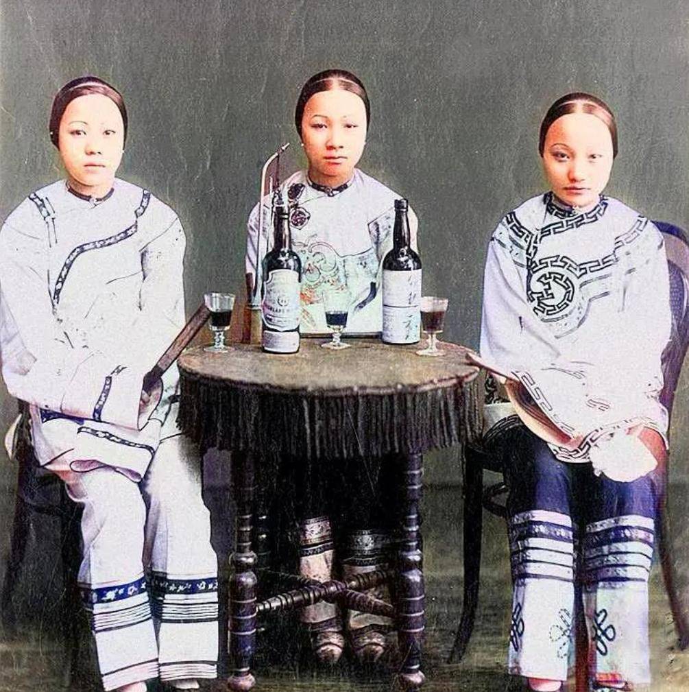 在三位姨太太的照片中,我们看到三位衣着考究、妆容精致的夫人。从她们身后的红木椅和雕花茶几可以看出,这应该是一户富贵人家,尤其是桌上的酒具显得格外显眼,说明他们家族的财富早已开始接触外来文化,甚至品尝洋酒,显示出他们家族的兴盛。这三位夫人坐姿端正、神情自若,她们的微笑和温婉气质也展现出她们作为豪门妻子的矜持和风度。