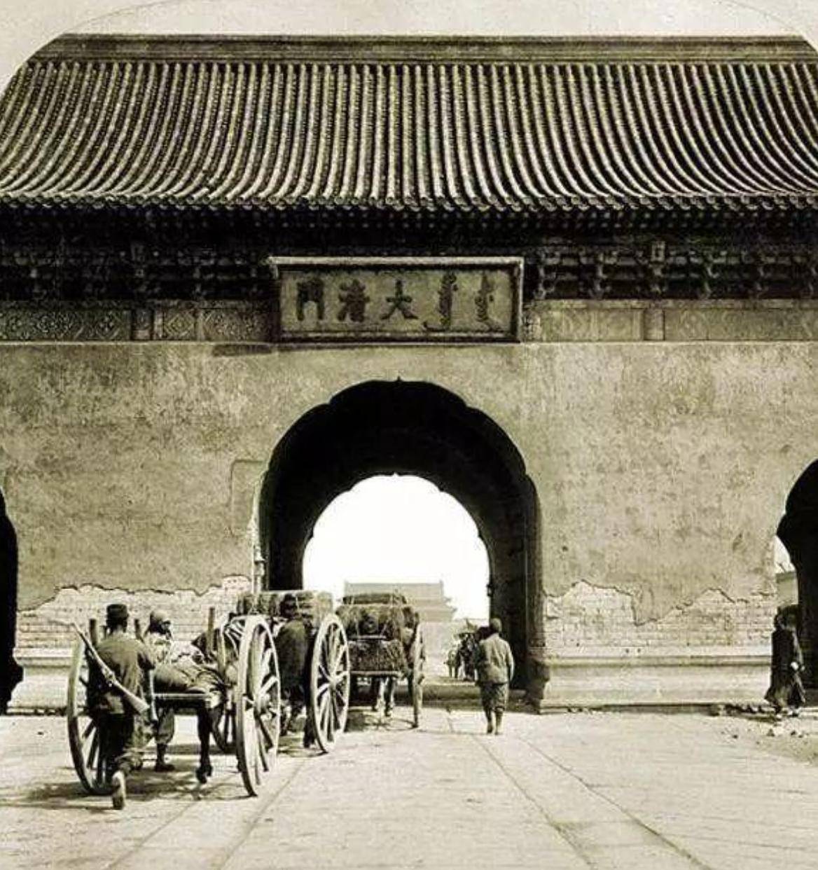 照片中的皇城大清门,曾经是清朝的象征,金字闪耀,巍峨壮丽。但如今,它已破旧不堪,墙皮剥落,残破的景象与历史的沉淀一起昭示着一个帝国的衰败。我仿佛看见在这些破败的城墙间,曾经辉煌的北京已步步走向崩溃。清朝的权臣贪污腐化,西方列强虎视眈眈,所有的风光早已不复存在。这座曾经的象征,