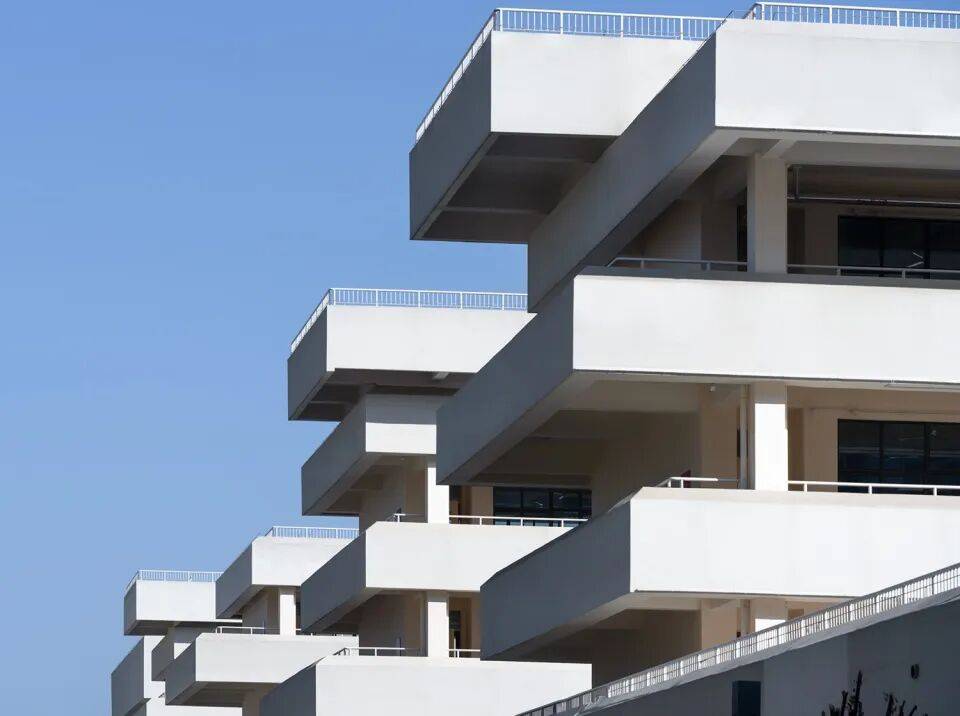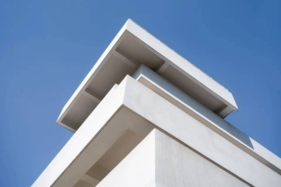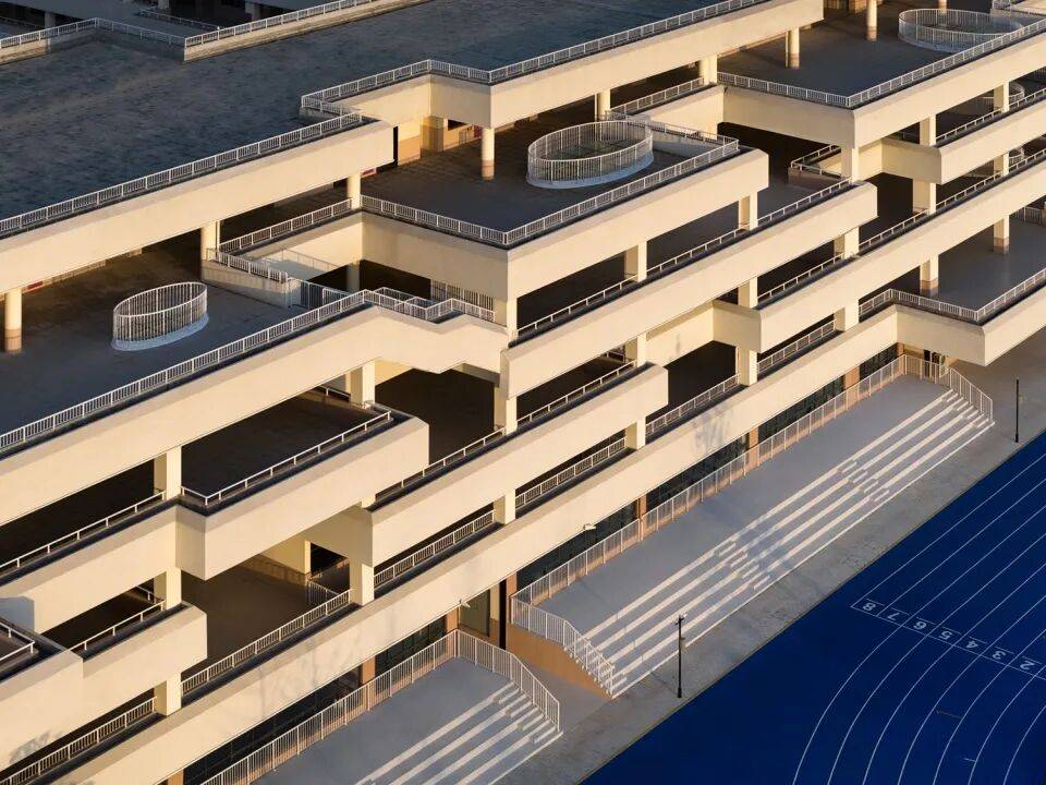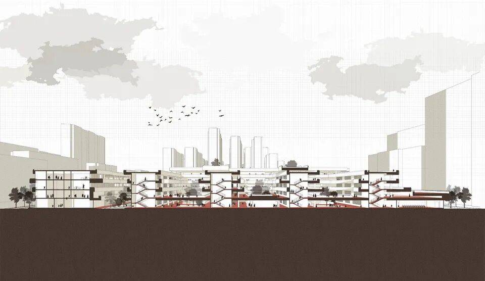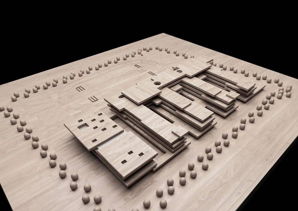 建筑体如同沉积岩结构,通过重叠楼板和模数搭建,形成不同的空间关系。