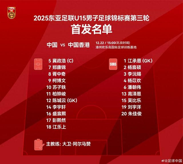 12月22日,U15国足在U15东亚杯最后一轮比赛中3比0击败中国香港队。3战1胜1平1负积4分,因净胜球劣势排在同积4分的韩国队之后,U15国足拿到第三名,得以继续留在A组征战下届赛事。