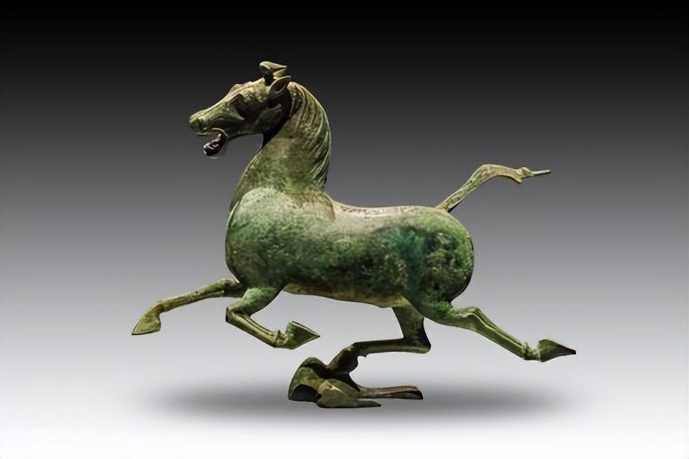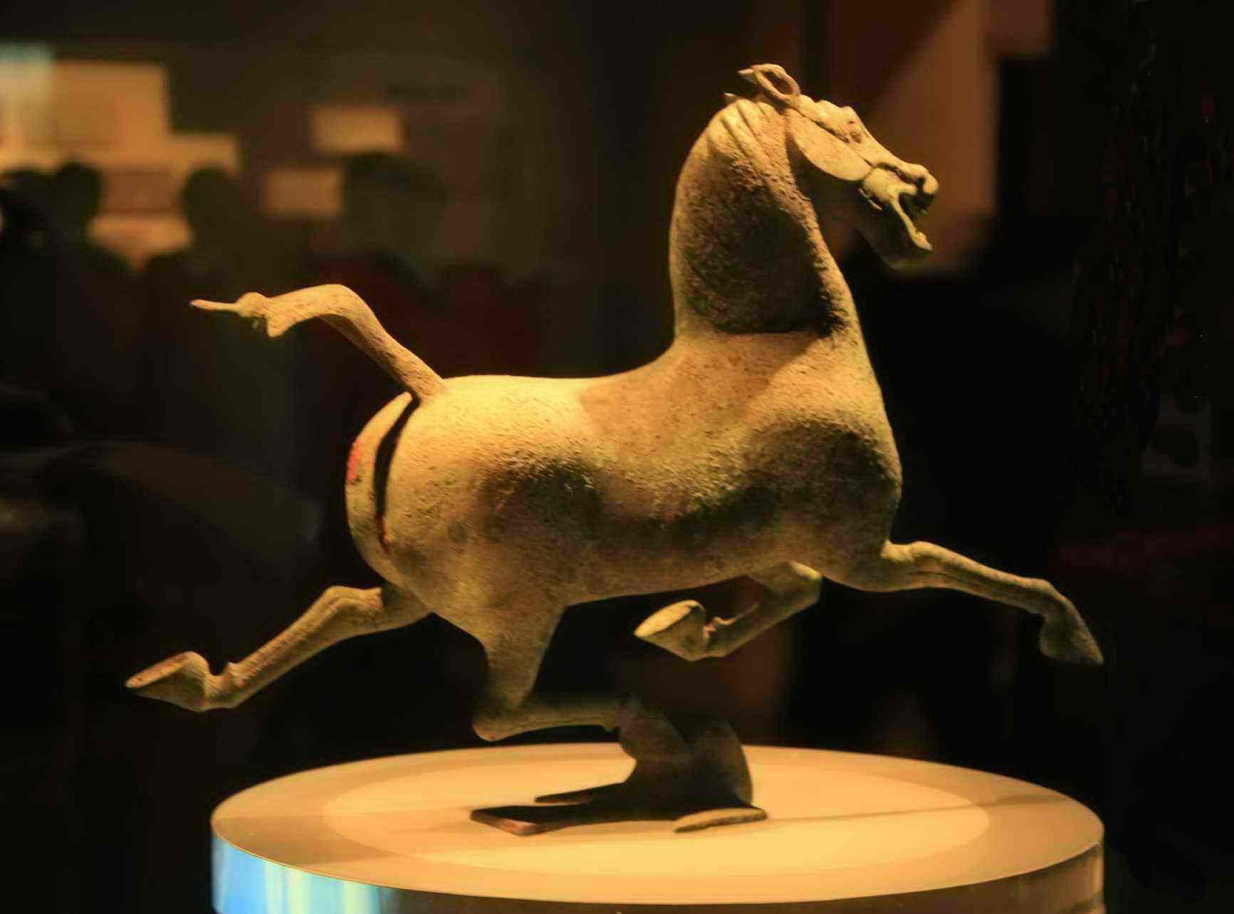 在汉代的文化语境中,马是一种极具象征意义的动物。汉武帝时期,为了对抗匈奴,河西走廊成为帝国西北防线的关键,而战马则是这条防线上的重要“武器”。战马不仅是交通工具,更是速度、力量和胜利的象征。而在铜奔马这件文物中,工匠以“三足腾空”的方式表现马的动态感,四肢中只有一蹄点地,看似轻盈,却传递出一种震撼人心的力量。可以说,这匹马不仅仅是为墓主人“守护”的随葬品,更是他生前力量与成就的象征。