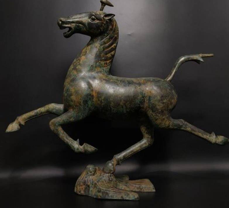 除此之外,马蹄下的飞禽还有一种可能——它是神话中的“金乌”或“龙雀”。在汉代神话中,“金乌”是太阳的化身,而“龙雀”是凤凰的一种,代表风的力量。汉代人相信,这些神鸟与天马一样,拥有超越凡世的速度与力量。铜奔马将马与飞禽结合在一起,很可能不仅仅是为了展示马的奔跑速度,更是在传递一种“天马行空”的浪漫与神秘感。脚下的飞禽无论是神鸟还是现实中的鹰,都象征着一种被战胜、被超越的力量,衬托出天马凌驾一切的速度与威严。