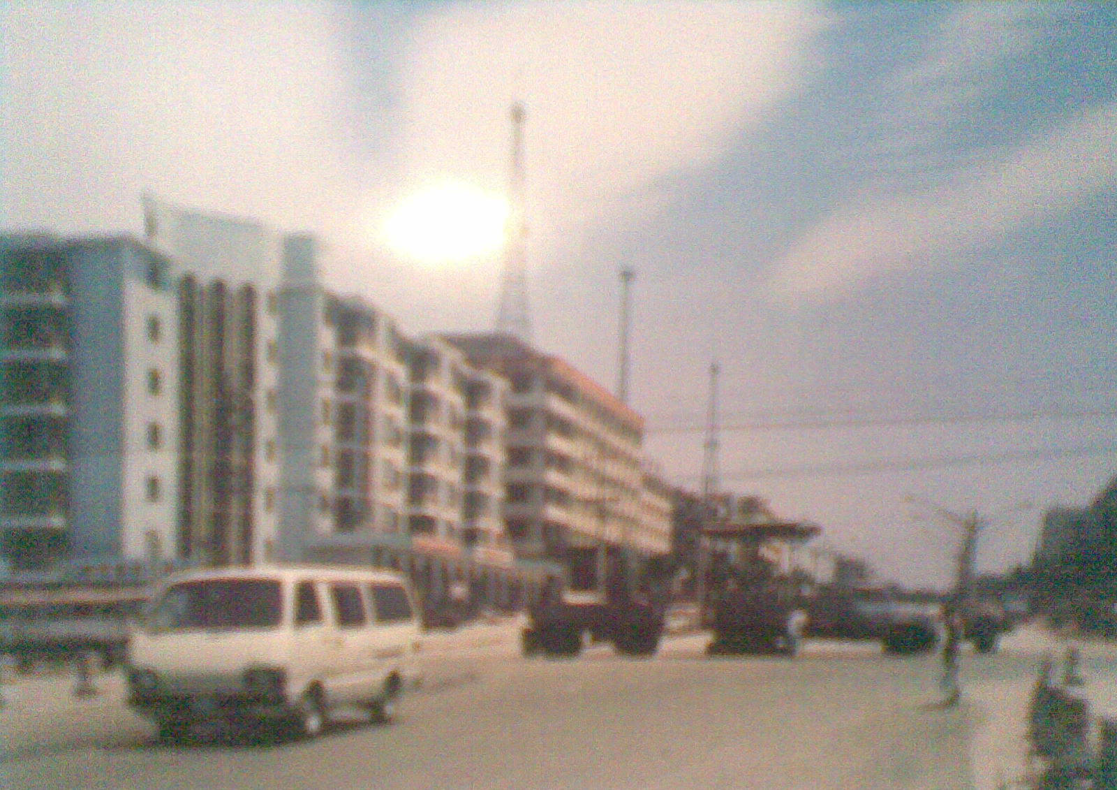 图片7 中街道两侧楼房林立,白色面包车停靠路边,高塔状物耸立远处,天空晴朗——适合进行建筑测绘、环境评估等专业调查。