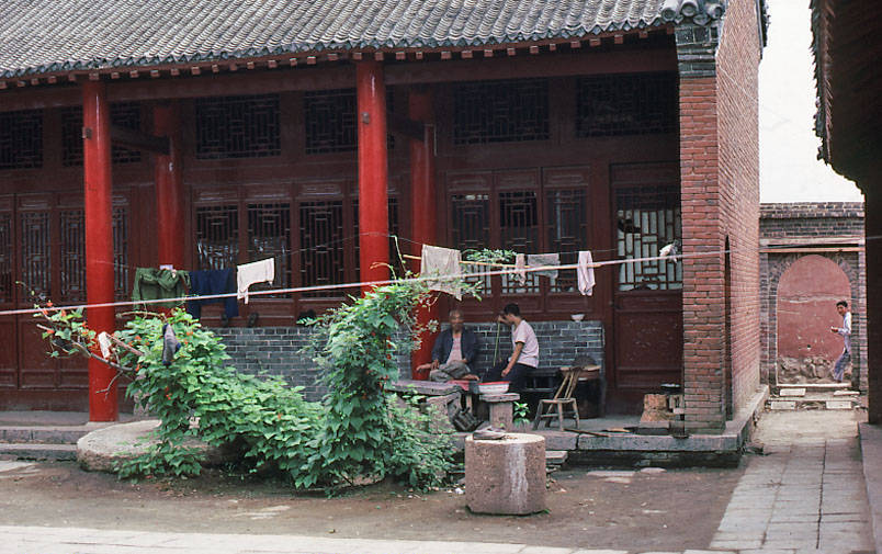 图片3 展现了一座典型的中式古建:红柱灰瓦、绿植环绕,门前两人正在桌边工作,一旁晾晒着衣物。这不仅反映了日常生活的气息,也可能暗示此处为修缮工人的临时驻地,体现了“人在景中修”的真实场景。