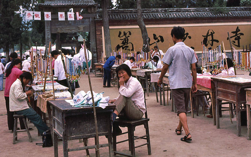 图片1 是唯一明确展现市井生活的影像:摊位前人流穿梭,背景赫然写着“嵩山少林寺”,表明此地为旅游与民俗交汇之所。