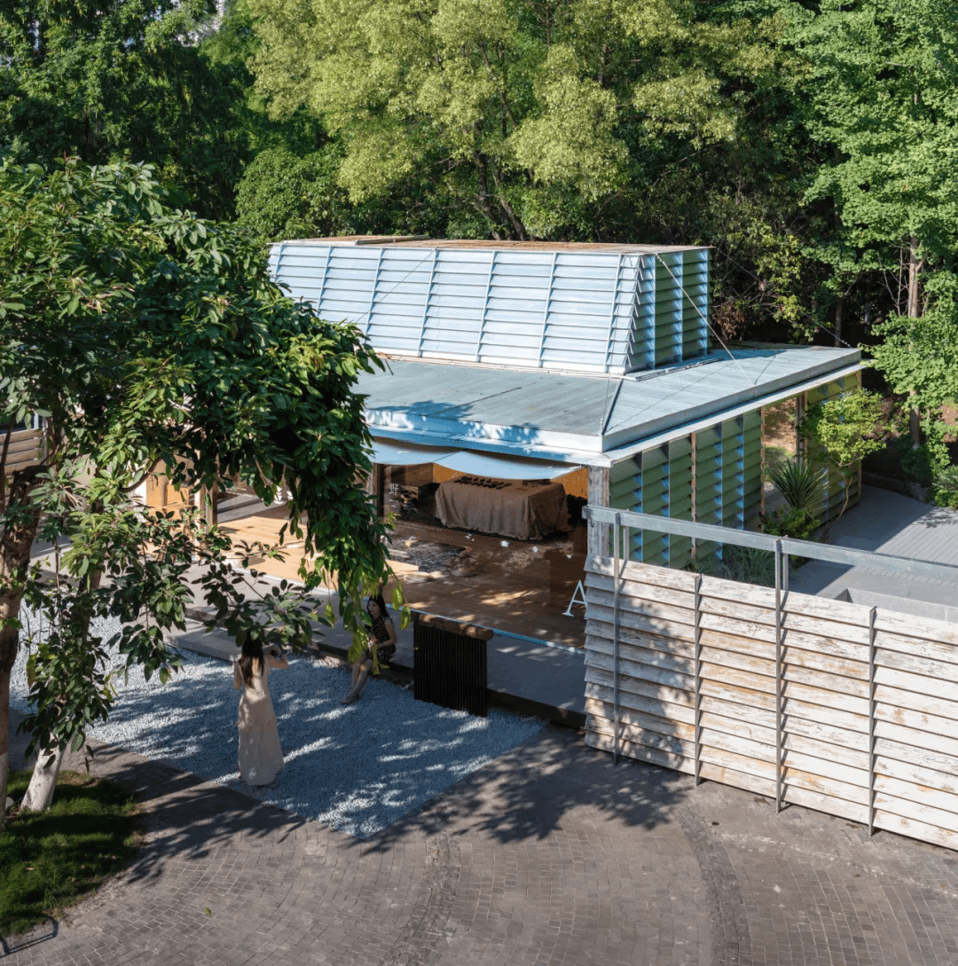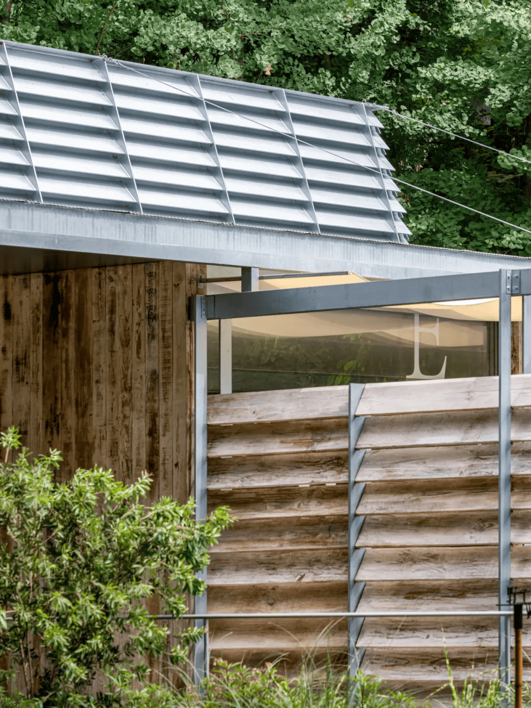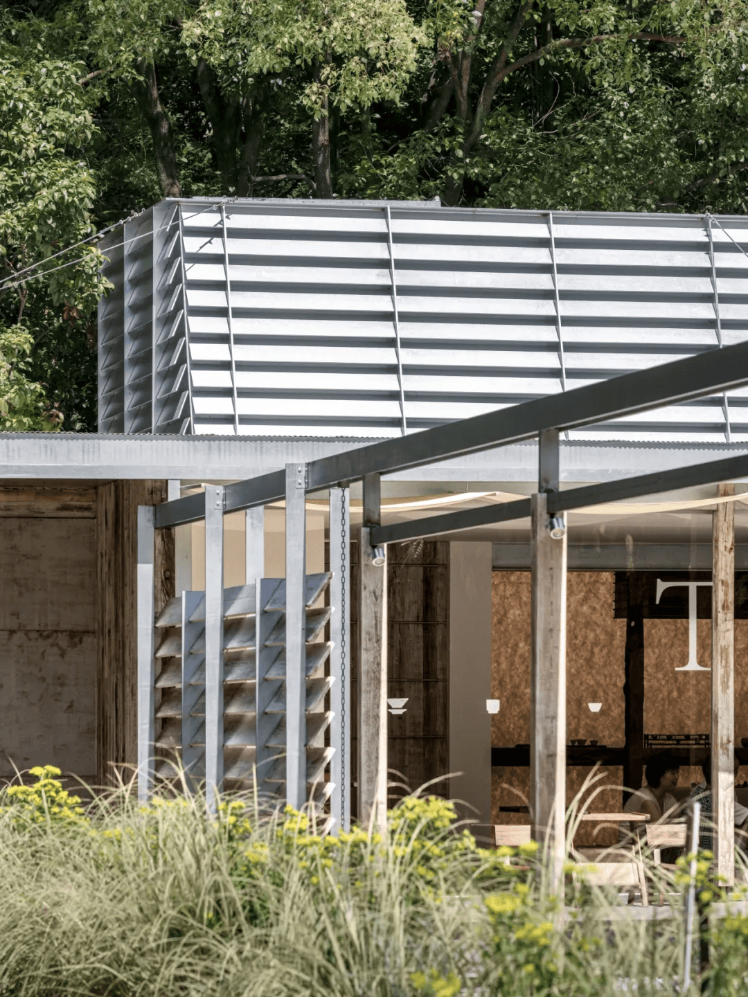 茶室由三面格栅围合而成,致密的镀锌钢板以及木板格栅重构出茶室的肌理,实时映照着外部自然的呼吸与脉动。出挑的屋檐与自然建立更立体的互动,当风和光进入,消解了人造建筑和自然的界限,描绘出沉静且充满夏日气息的氛围。