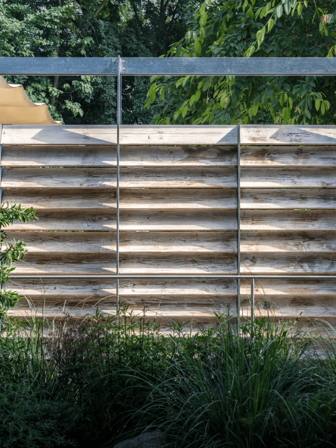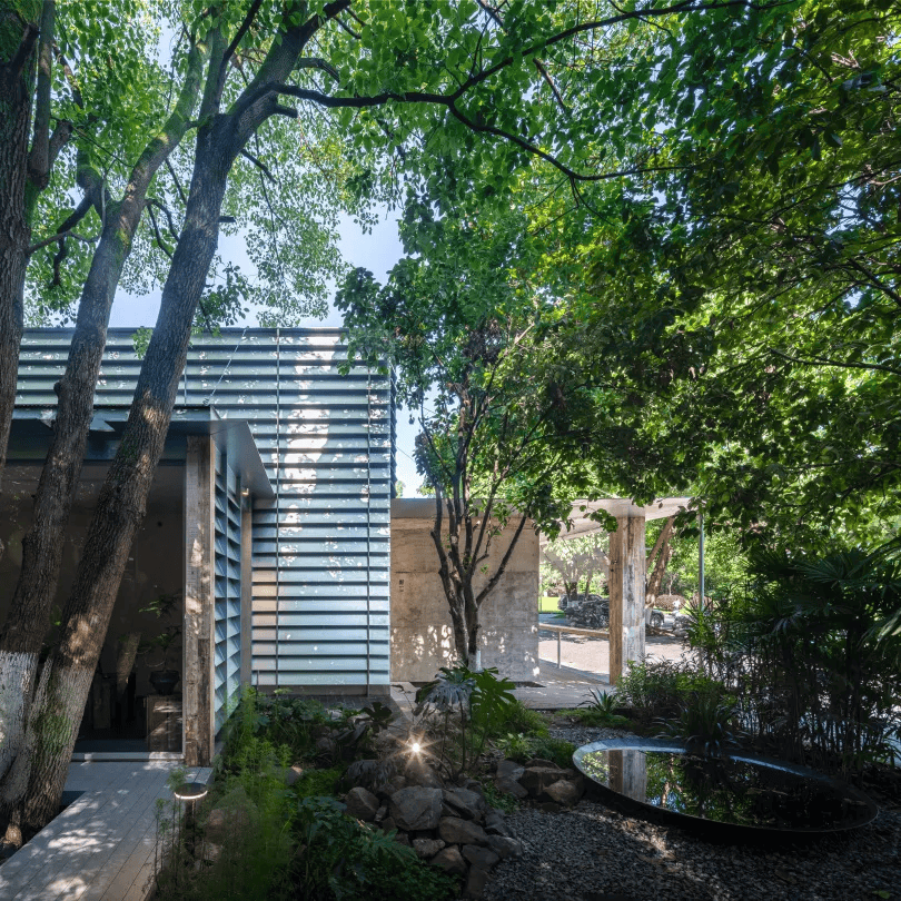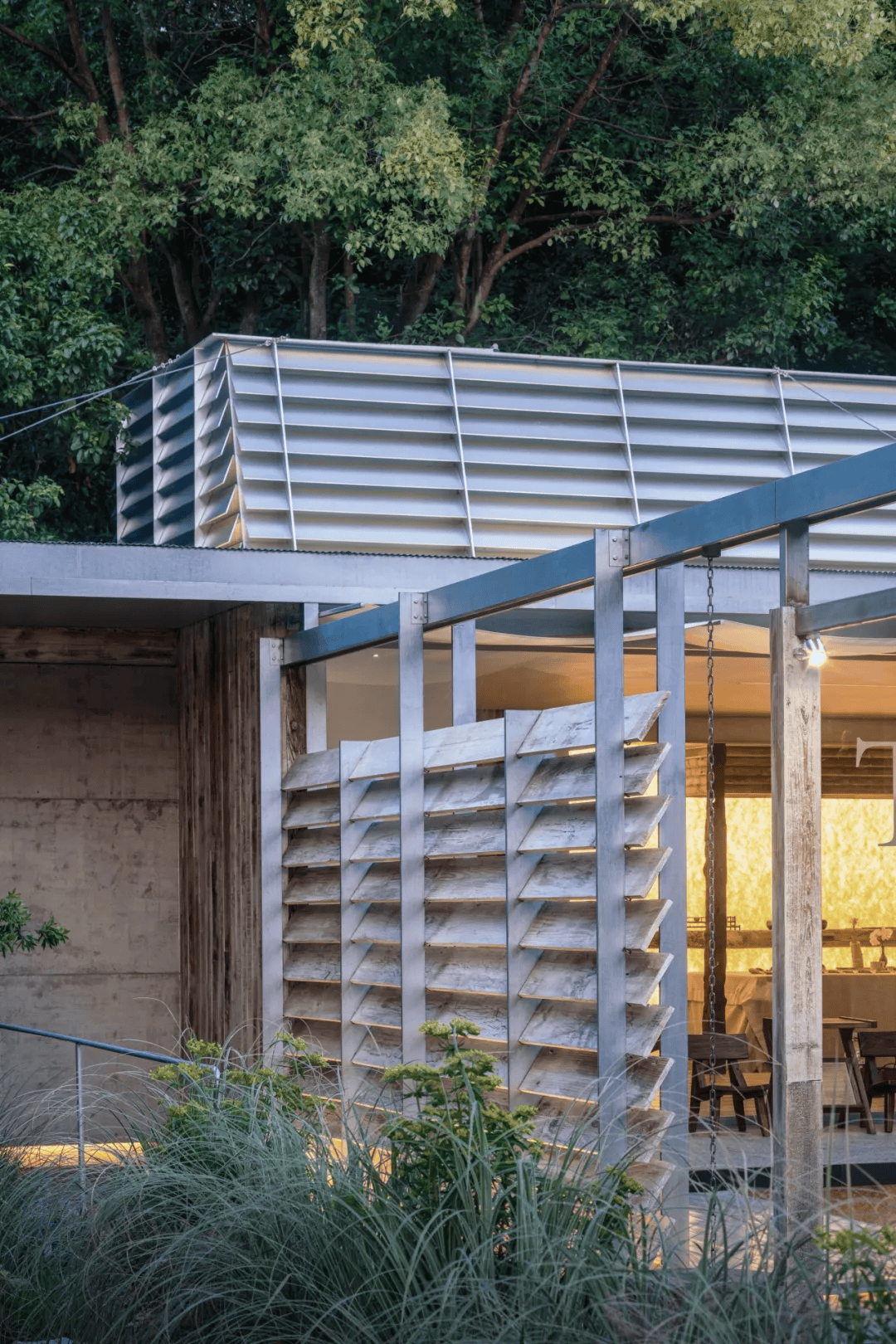 茶室由三面格栅围合而成,致密的镀锌钢板以及木板格栅重构出茶室的肌理,实时映照着外部自然的呼吸与脉动。出挑的屋檐与自然建立更立体的互动,当风和光进入,消解了人造建筑和自然的界限,描绘出沉静且充满夏日气息的氛围。