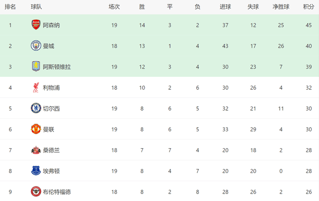 | 1 | 阿森纳 | 19 | 14 | 3 | 2 | 37 | 12 | +25 | 45 |