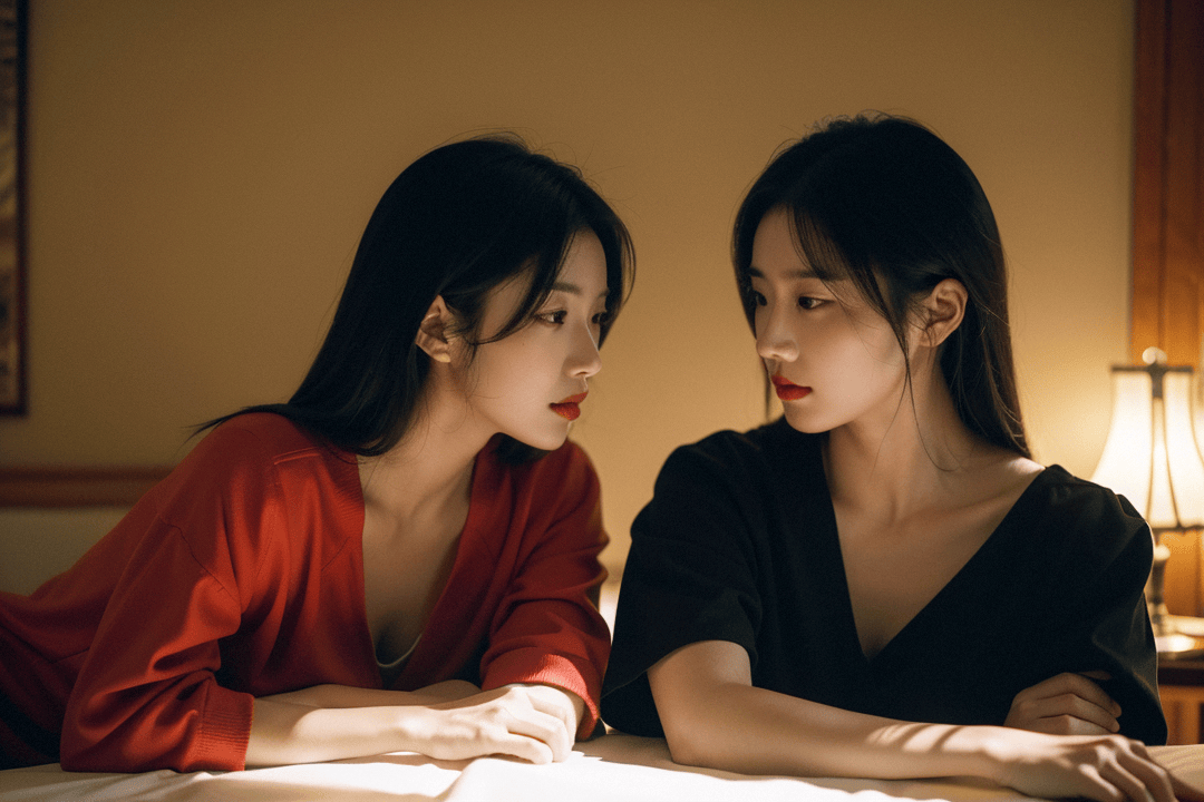 画面描述:红衣与黑衣女子相对而坐,台灯照亮彼此面容,眼神专注交流。