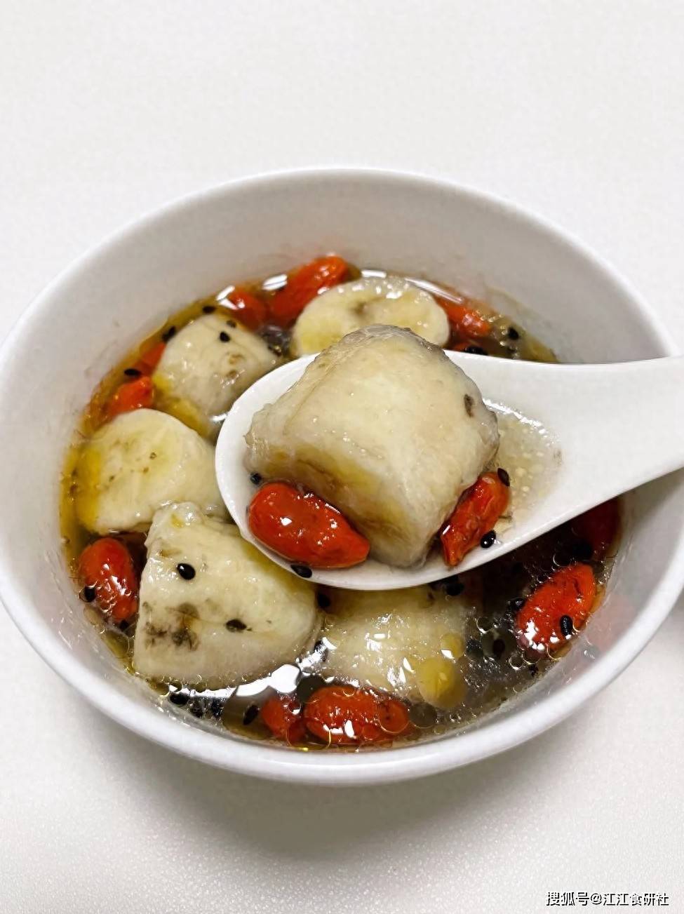 | 图1、图2、图3 | 碗中盛有香蕉段,撒黑芝麻、枸杞,带汤汁,勺子舀起香蕉 | ✅ 黑芝麻香油蒸香蕉 | 香蕉+黑芝麻+香油+枸杞 |