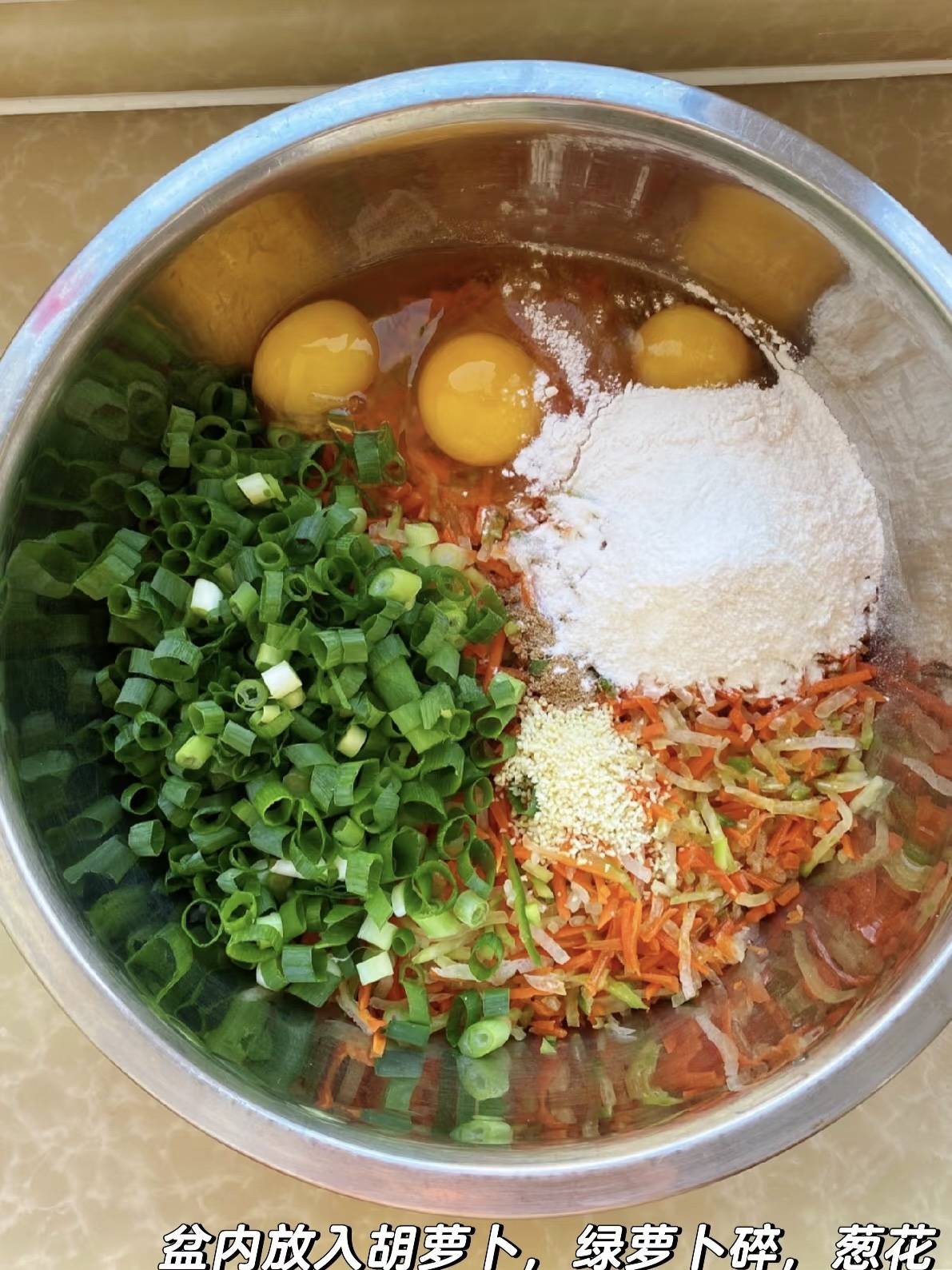 先给胡萝卜和青萝卜洗个澡,用擦丝板“呲呲”两下,变成一池彩虹丝。撒一小撮盐,像给萝卜做汗蒸,五分钟就能逼出水分,同时去掉辛辣,留下的只有清甜。别急着扔那碗淡粉色的萝卜水,留两勺,后面有彩蛋。把挤干水分的萝卜丝剁几刀,别太碎,保留一点纤维感,吃起来才有“咔呲”小惊喜。扔进大碗里,加一把葱花,像撒绿色小星星;再来半勺姜末,去寒又提味;一小撮十三香,瞬间把“素”字升级成“香”字。灵魂是两大勺面粉+一小勺泡打粉,面粉负责抱团,泡打粉负责让丸子在油锅里偷偷膨胀,形成空心的“小气球”。调味只需要最简单的:半勺盐、一点点白胡椒,别忘了刚才留的萝卜水,倒两勺进去,既环保又增加天然甜味。用筷子顺时针搅三十圈,面糊会变得越来越有脾气,黏糊糊地挂在萝卜丝上,能轻松捏成小团子就说明成功。如果太稀就补面粉,太干就加凉水,一切以“能成团不掉渣”为及格线。