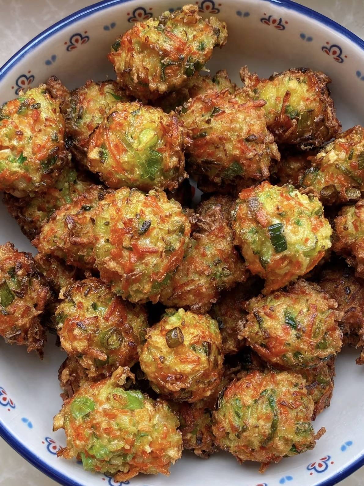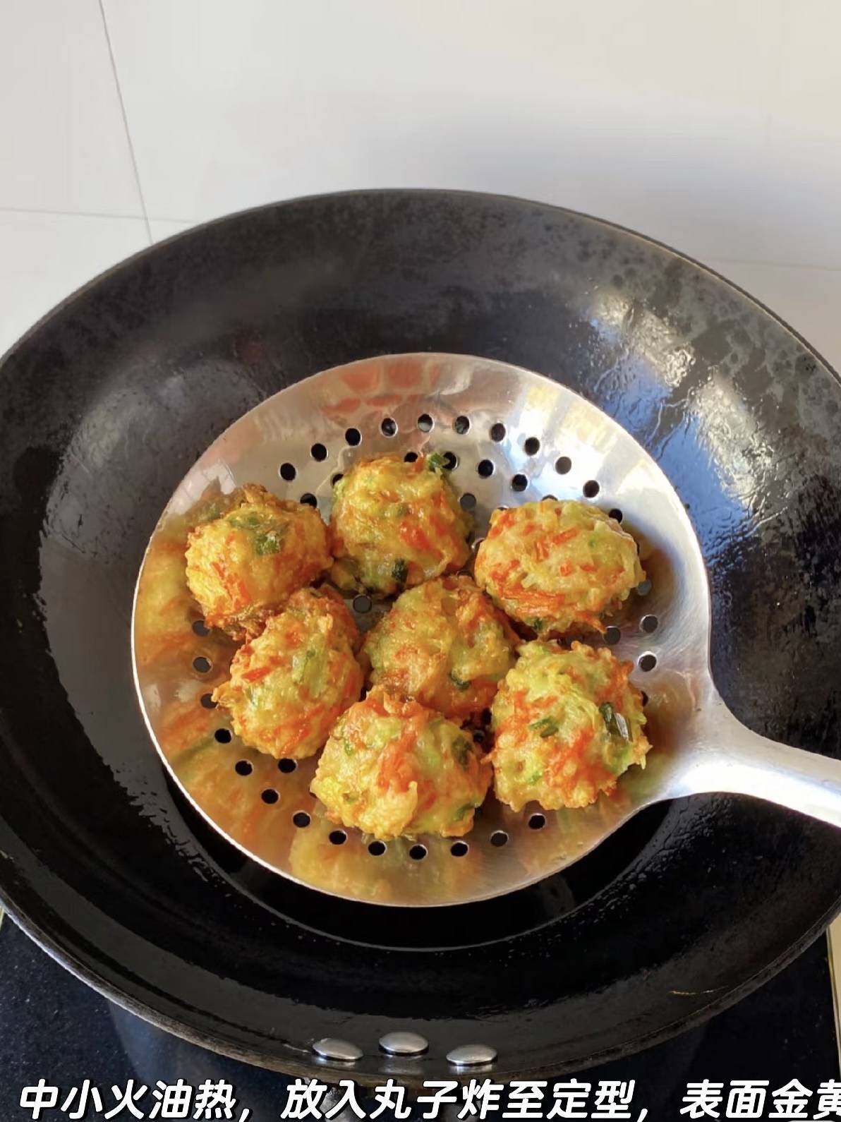 油锅登场,倒油到锅深三分之一,中小火加热。检验油温的秘诀:把筷子头插进去,周围冒出细密小泡泡,说明“温泉”已就位。双手沾点水,抓一把面糊,从虎口挤出一个小圆球,用勺子一刮,轻轻滑进油锅,动作要快,姿势要帅,像下一场“萝卜流星雨”。丸子下去先沉底,别急着动,等它自己浮起来,再用筷子轻轻拨,让每一面都均匀上色。大约两分钟,表面变成金琥珀色,就能出锅。厨房瞬间开启“油炸滤镜”,空气里都飘着麦芽糖的焦香,邻居的油烟机都开始嫉妒。趁热咬一口,外壳像薯片一样“咔嚓”碎裂,里面却是萝卜丝的清甜与葱香交织,因为泡打粉的助攻,中心形成小小的空气囊,完全不油不腻。