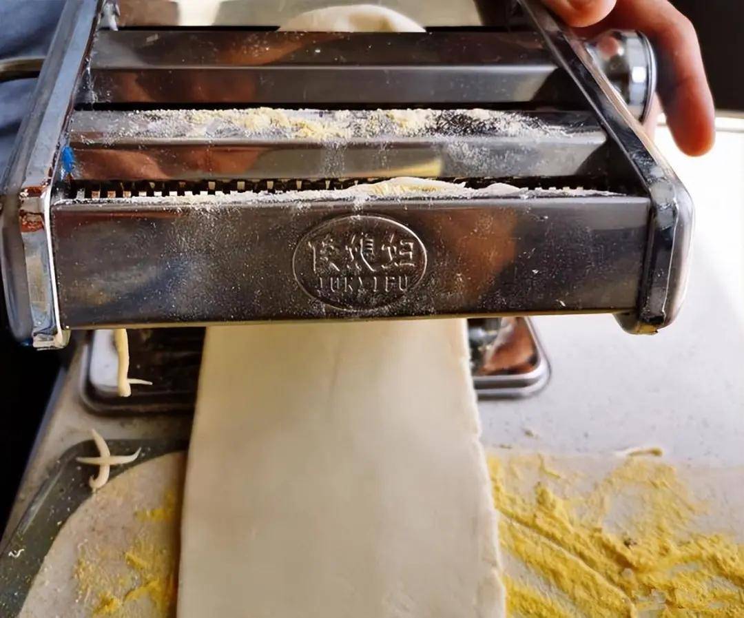 用面条机将面皮擀薄。