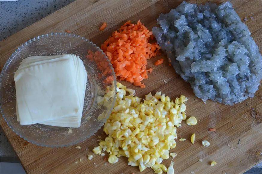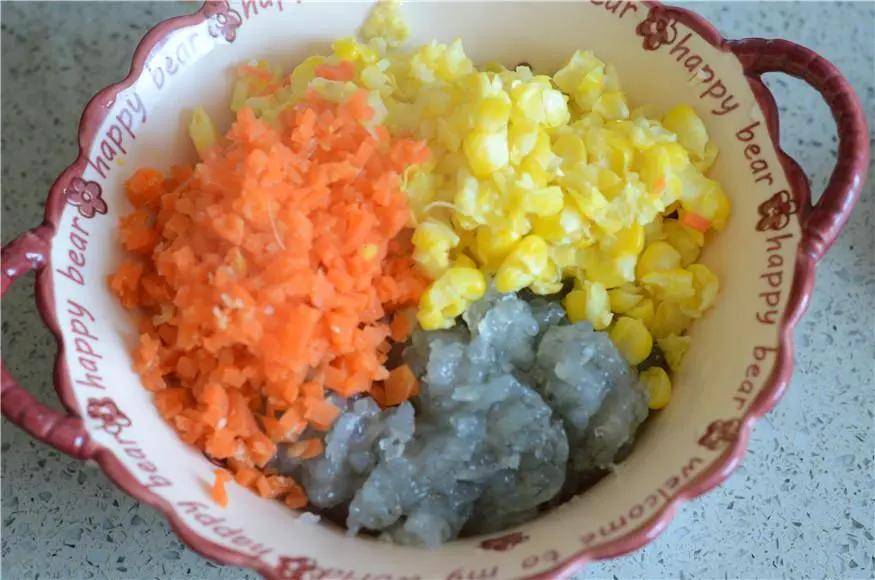 基围虾去虾线去壳后剁成泥,胡萝卜切小丁,玉米稍微切碎点,所有的食材都准备好。