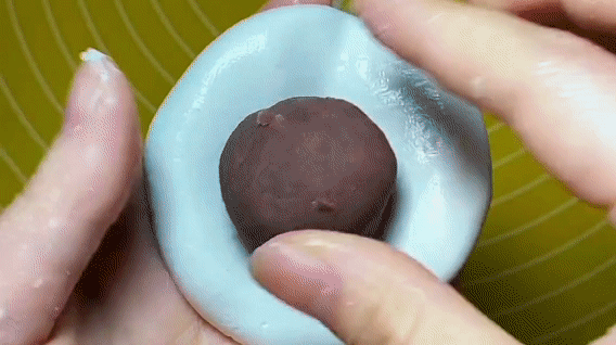 4.用虎口收拢法把馅料紧紧包住。切记一定要包严实,不要露馅,再整理成圆球。