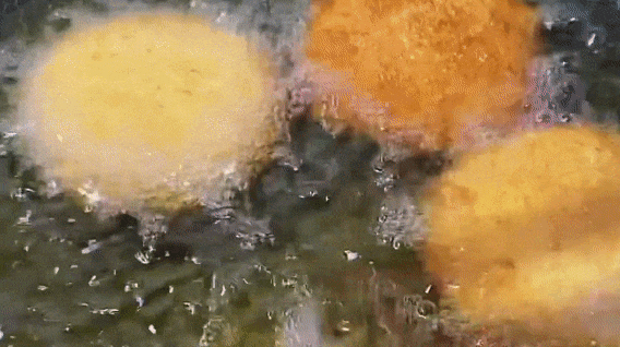 7.下锅定型飘起后,再用筷子轻轻翻动,让炸糕受热均匀,这样也不容易露馅。