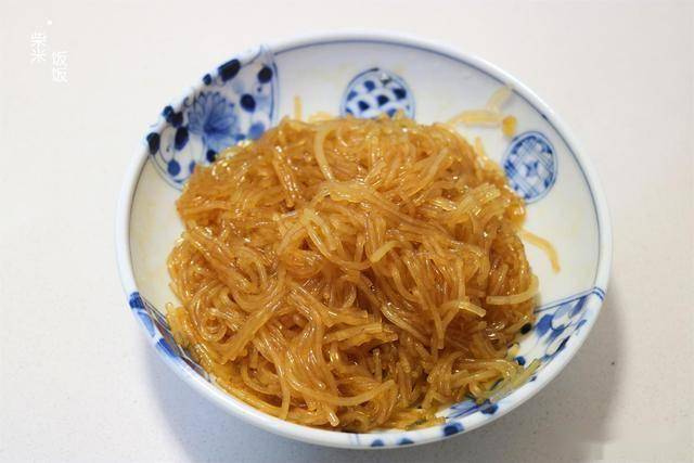 3,红薯粉条开水煮到没有硬心,捞出来加点生抽拌匀,既能上色,又能入点底味。