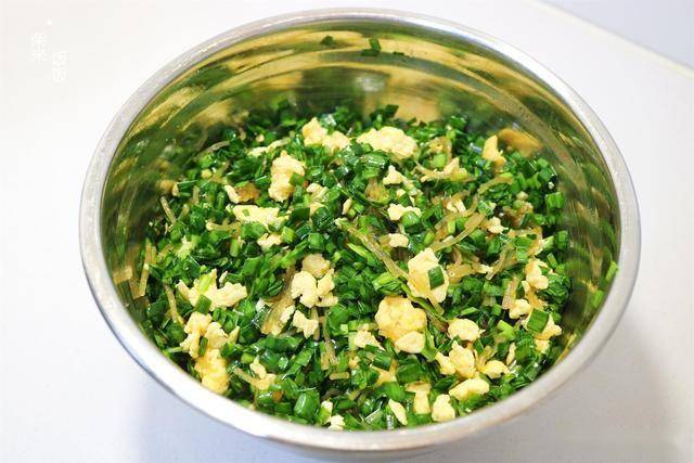 4,韭菜洗净晾干,再切碎。放入炒熟的鸡蛋和处理好的红薯粉条,调味就只加盐、花椒粉,再来点熟油,拌匀这个馅料就调好了。