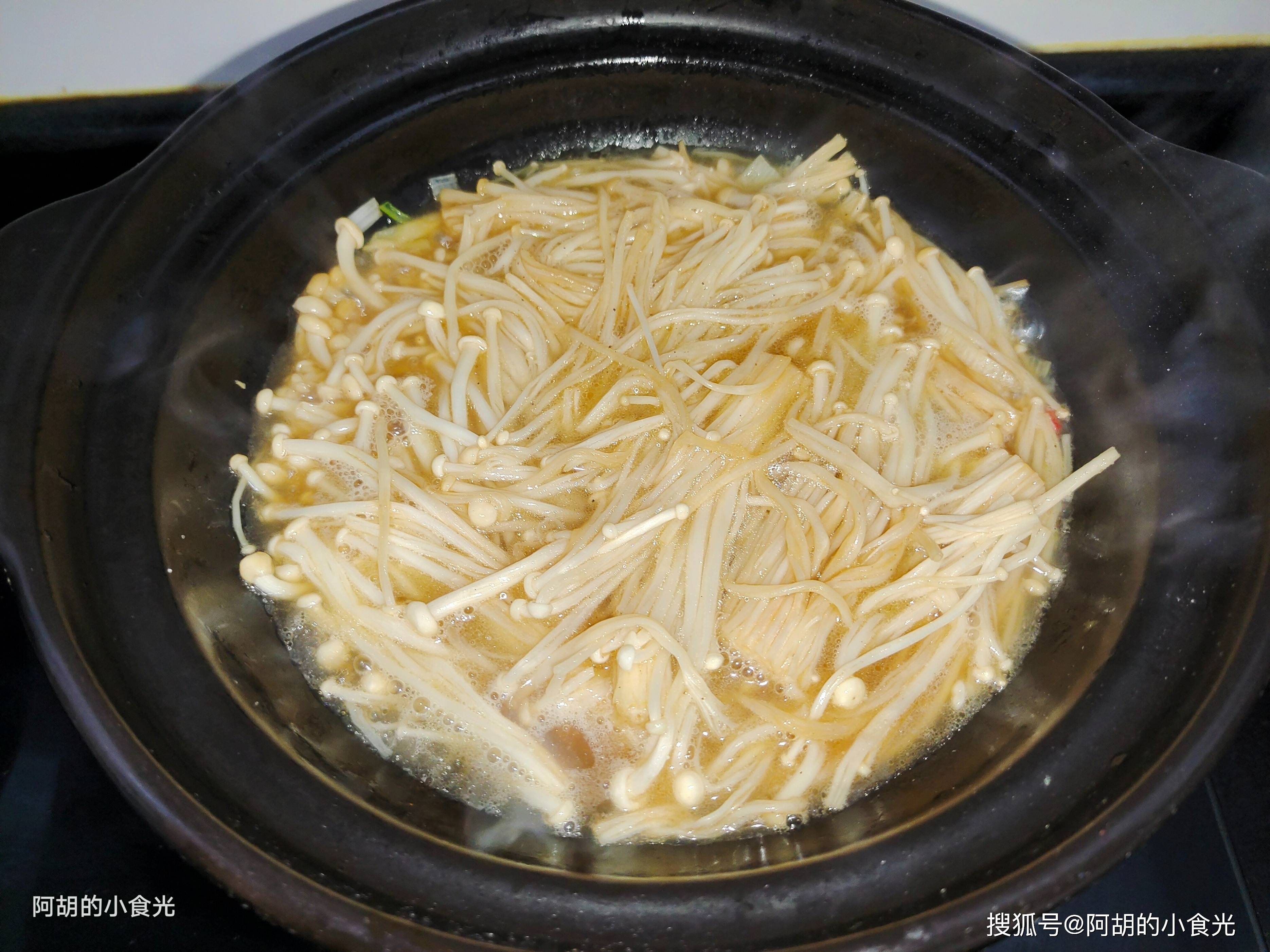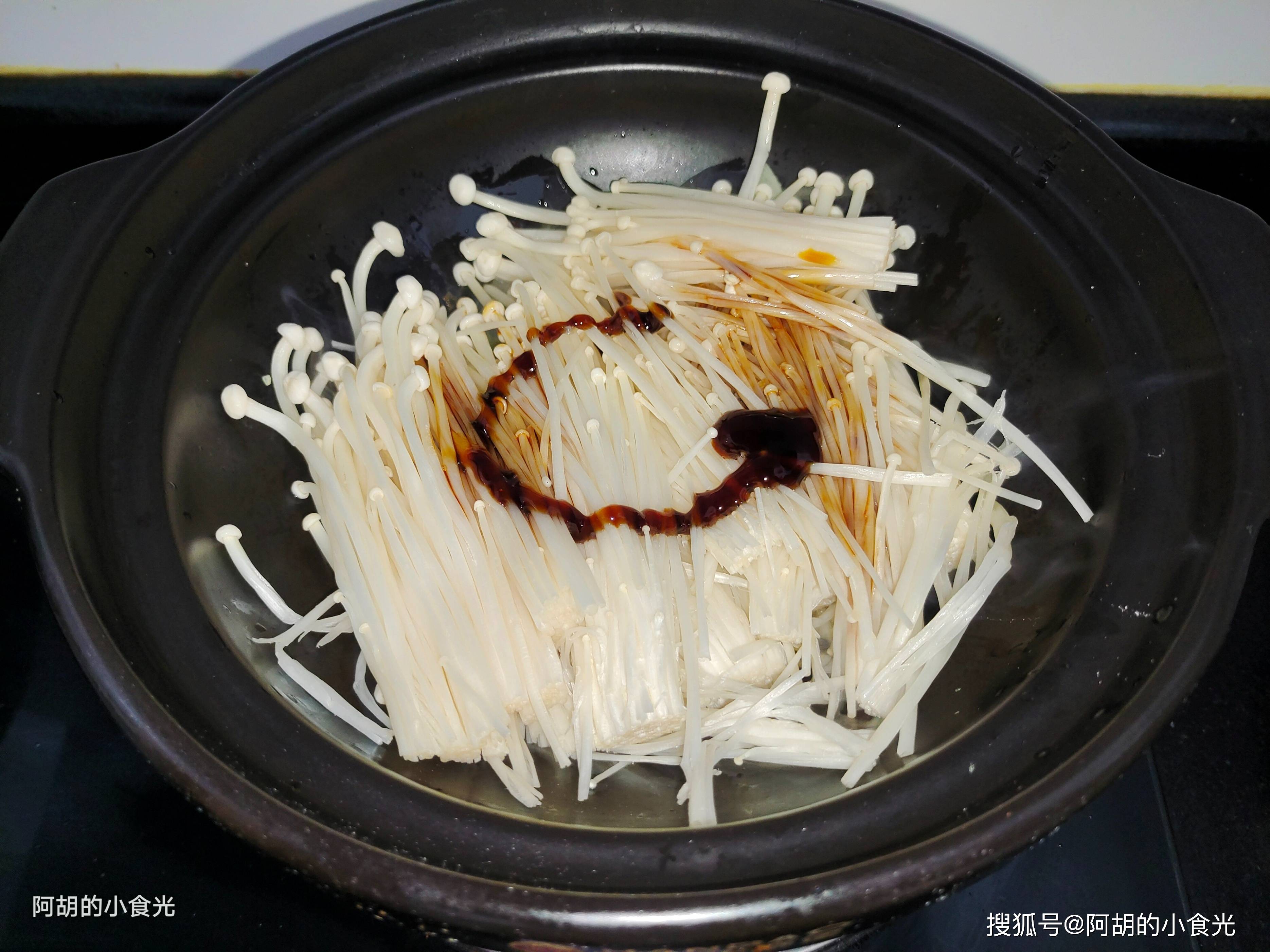 第三步:准备一口砂锅,置于灶火上先小火加热几分钟,让砂锅预热后就淋入一些花生油烧热,把小料葱蒜末下锅炒出香味,再将金针菇入锅,淋入一些生抽、蚝油,再撒入一些食盐炒一炒。金针菇微软后就加入开水适量,就这样保持小火让其在一边煮着。