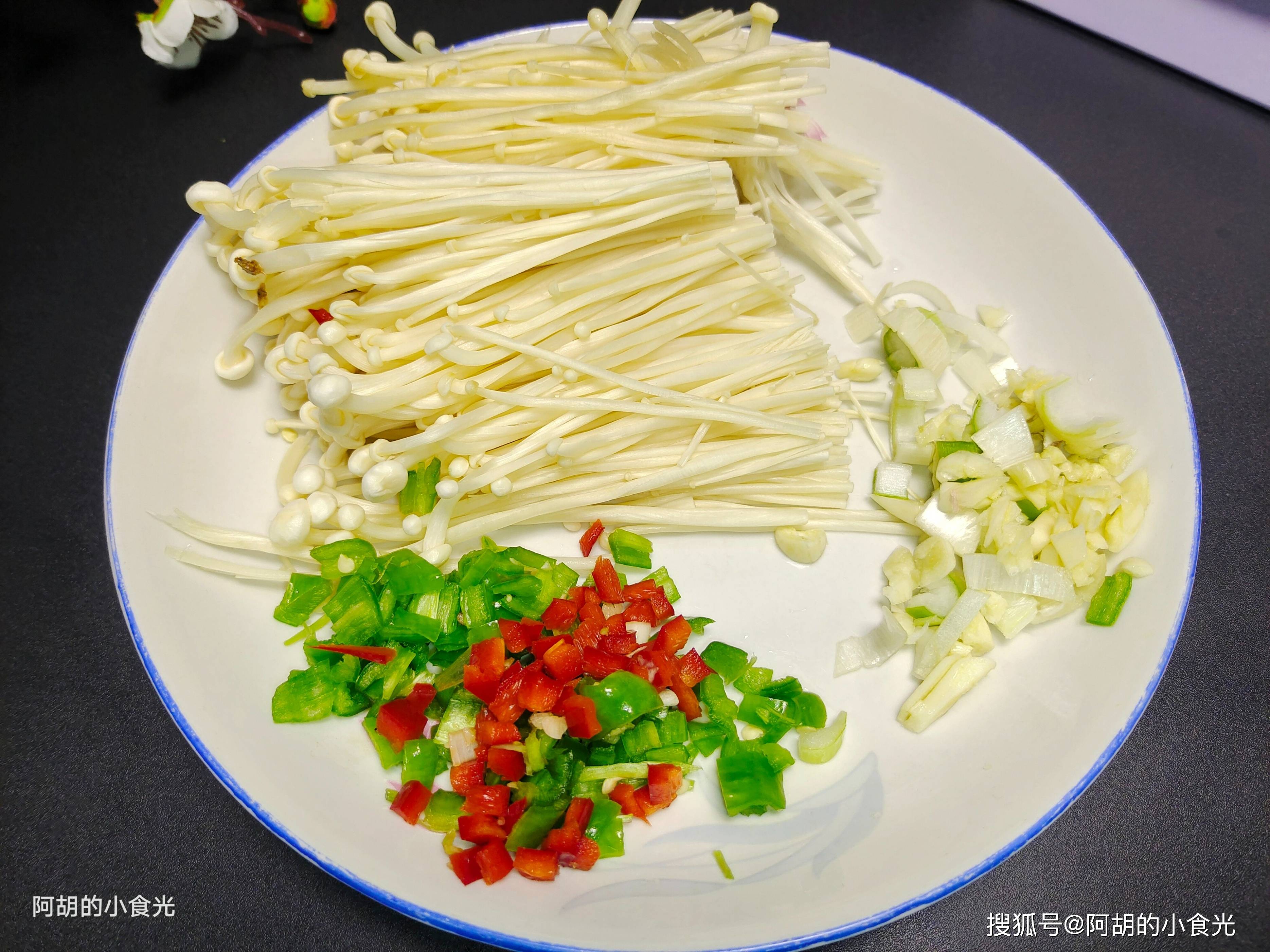 第二步:今天的配菜很简单,就是一把金针菇,洗干净后挤干水分待用。再来一些青红椒切碎成小颗粒待用。一些葱蒜末作为小料使用。还有最关键的4个鸡蛋磕入碗中后搅散待用。