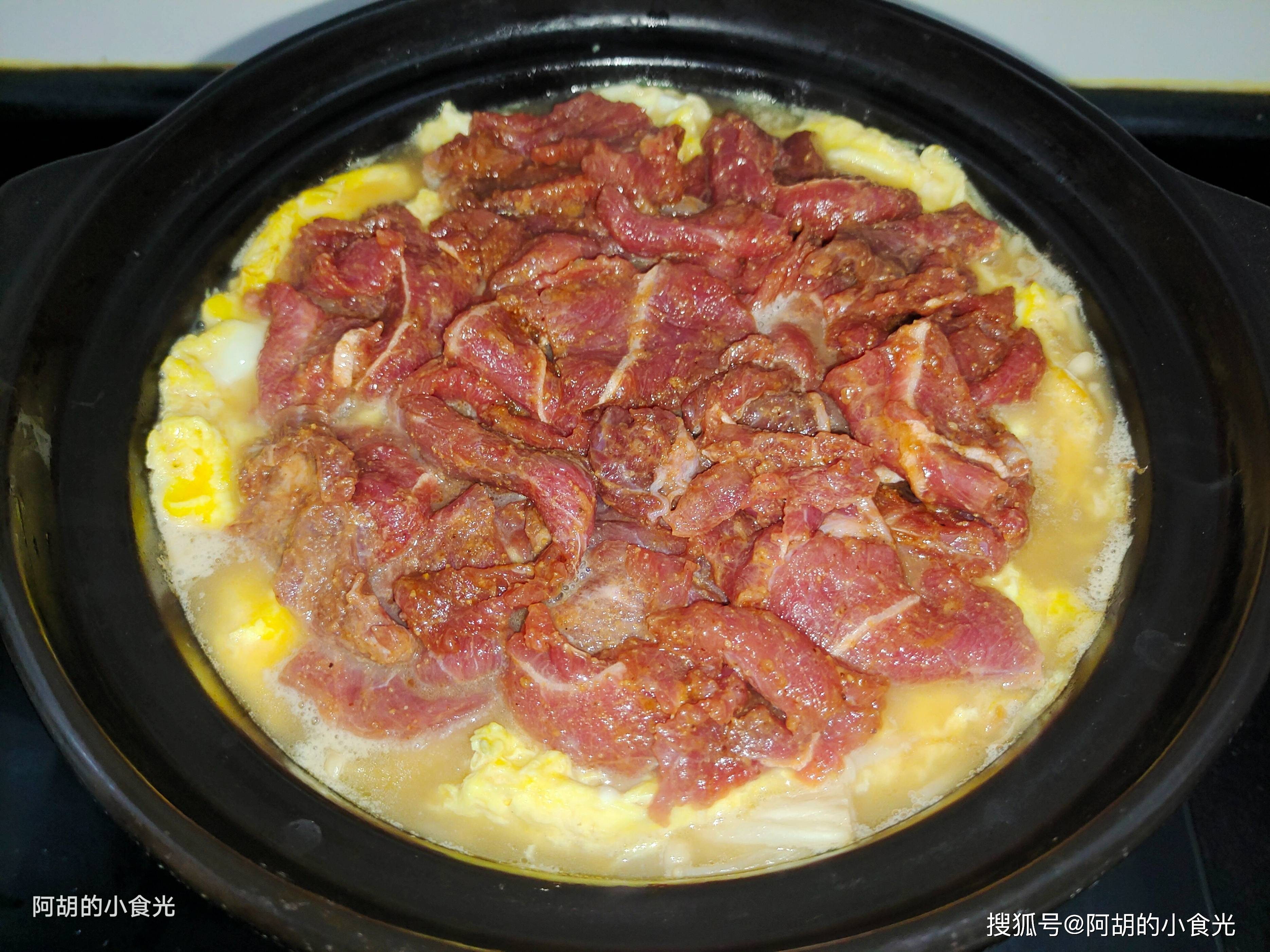 第五步:砂锅中不用关火,把第一步中腌制好的牛肉取出,一片一片地铺在鸡蛋上面,整理好后就加盖转为大火煮个十分钟,时间到后开盖撒入一些青红椒粒再焖煮一分钟就可以关火上桌了。连锅一块上桌,还在咕嘟咕嘟地抱着热气,开盖就是香味扑鼻,牛肉和鸡蛋的搭配鲜嫩无比又营养满满,热乎乎的一锅太暖人、太下饭了!感兴趣的一定要试一试这个做法,保证惊艳。