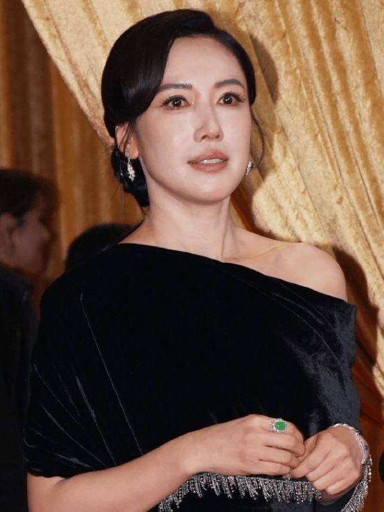 微微露出一抹香肩,配上低丸子头,整个人贵气尽显,不知道的还以为是豪门阔太登场了。