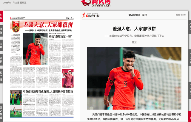 内容:该图片是新民网的网页截图,日期显示为2026年01月09日星期五,页面有《东方体育日报》的报道截图,标题是“差强人意,大家都很拼——首战0:0战平伊拉克,李昊屡现神扑力保球门不失”,右下方有一张穿着红色球衣的足球运动员图片