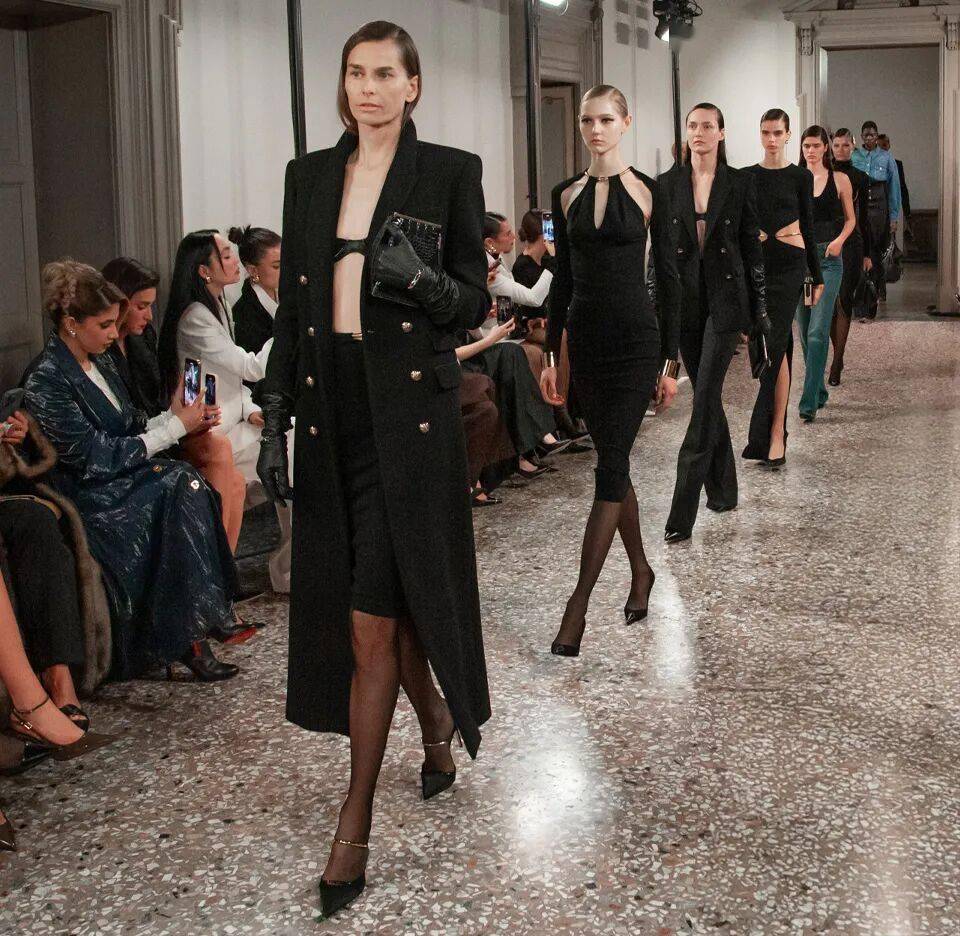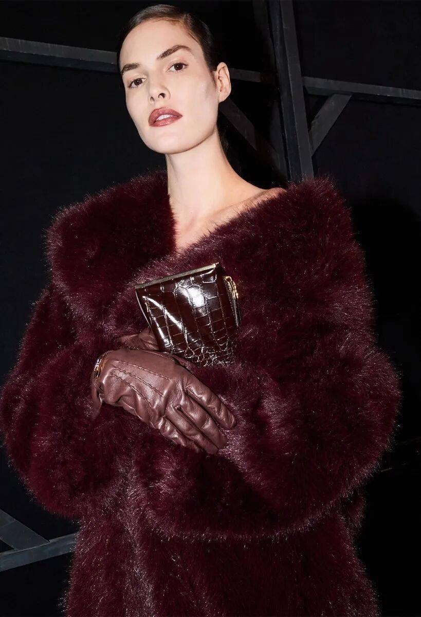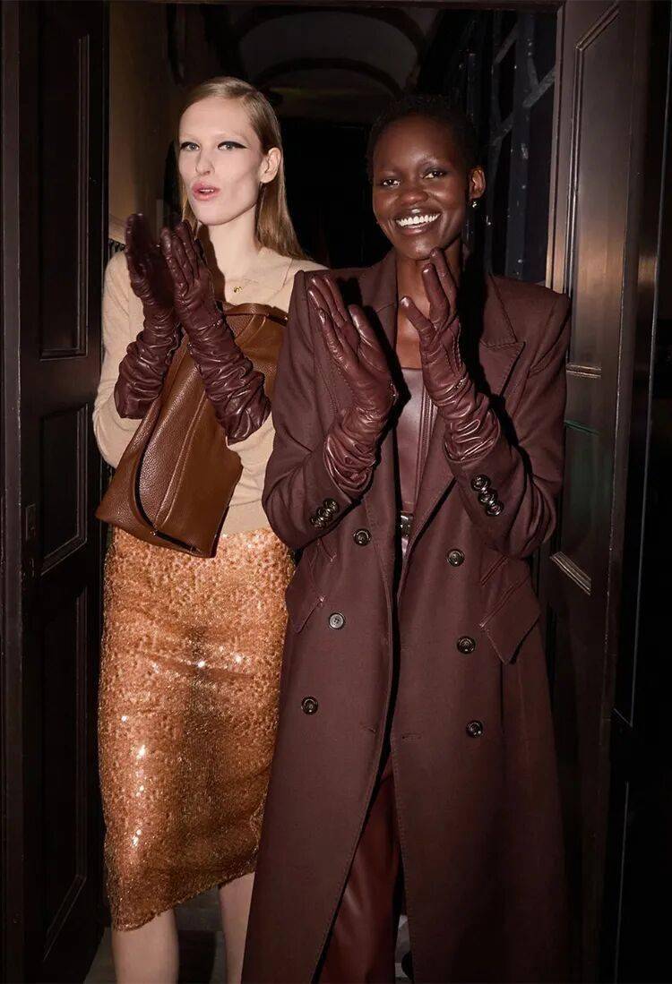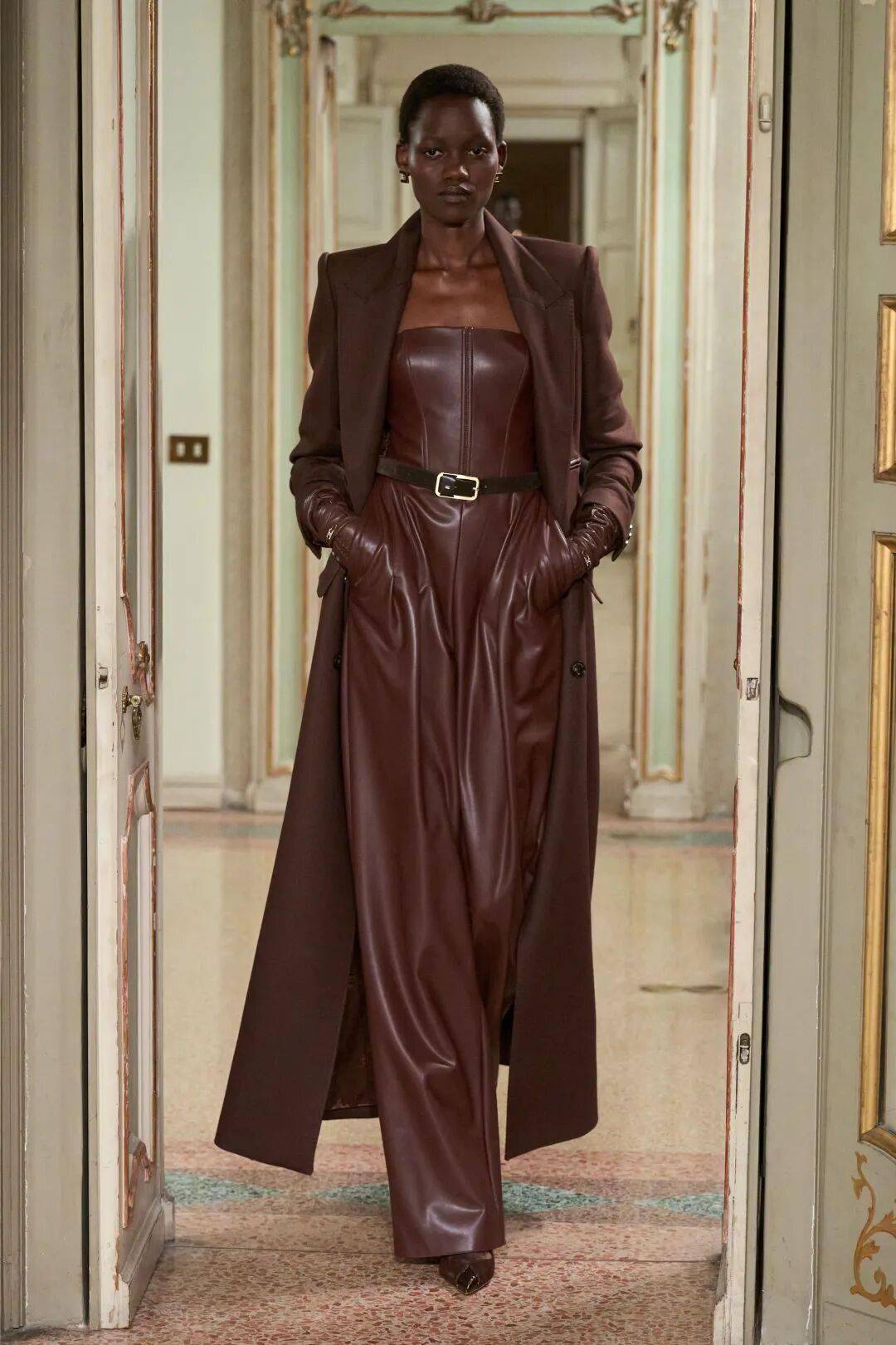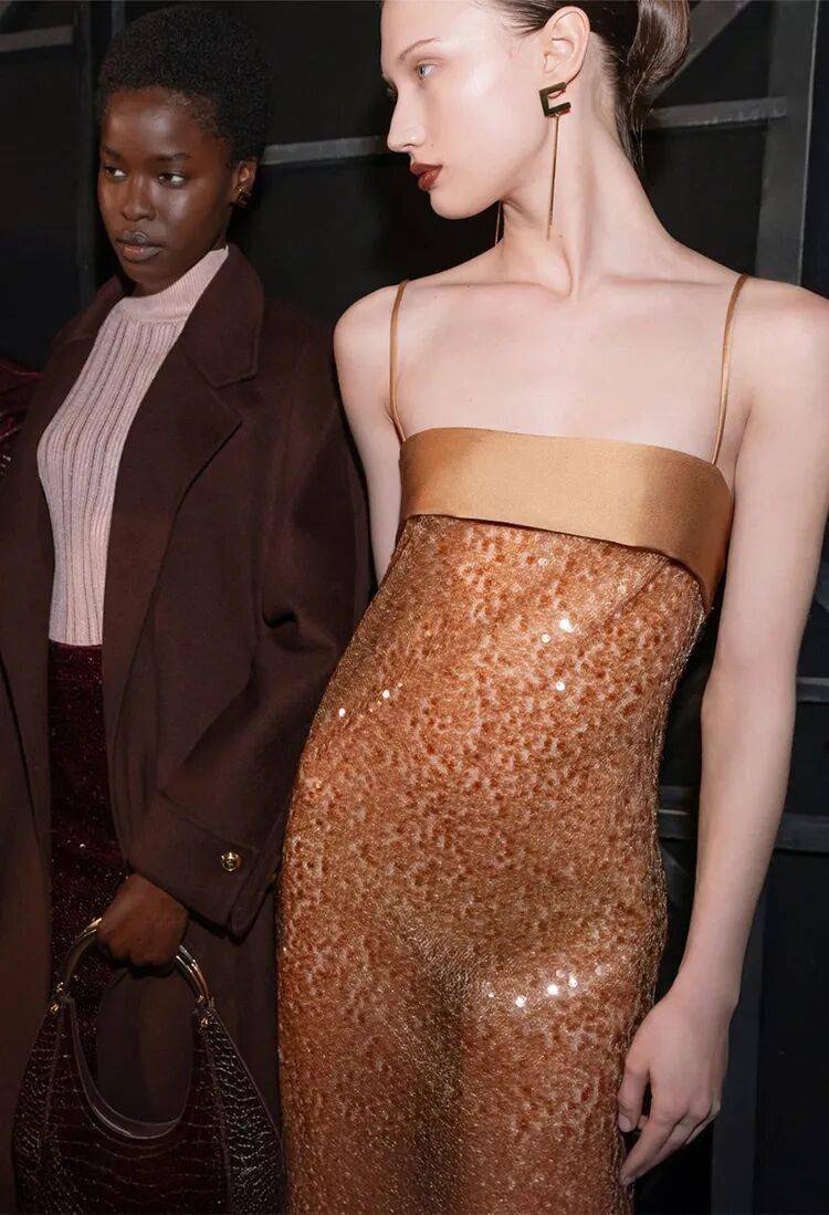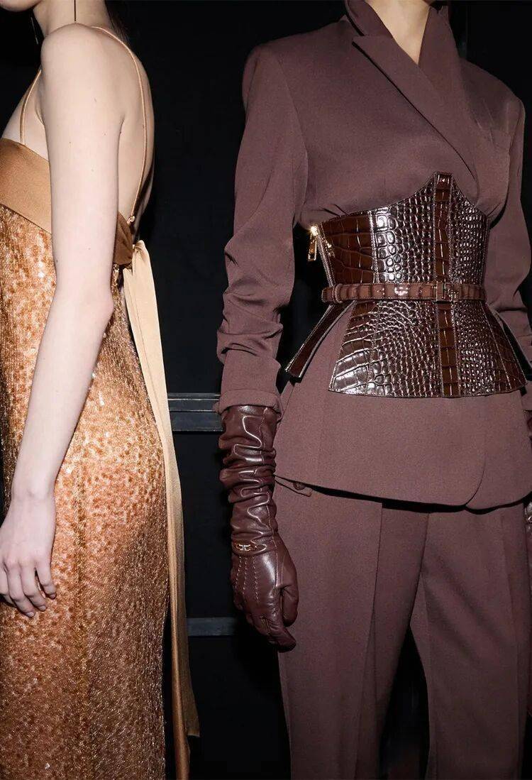 Elisabetta Franchi秋冬系列以深沉黑咖色系为主基调,搭配米白暖棕过渡色,通过酒红色点缀和多材质混搭,展现沉稳优雅与现代力量感的平衡。