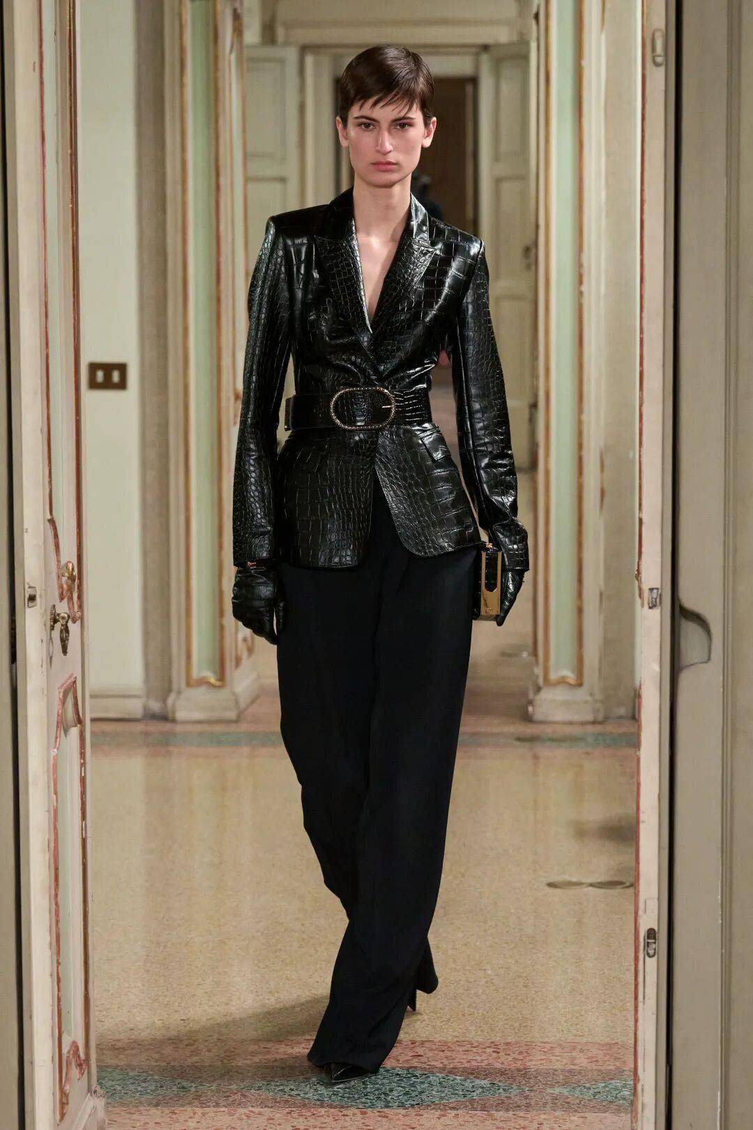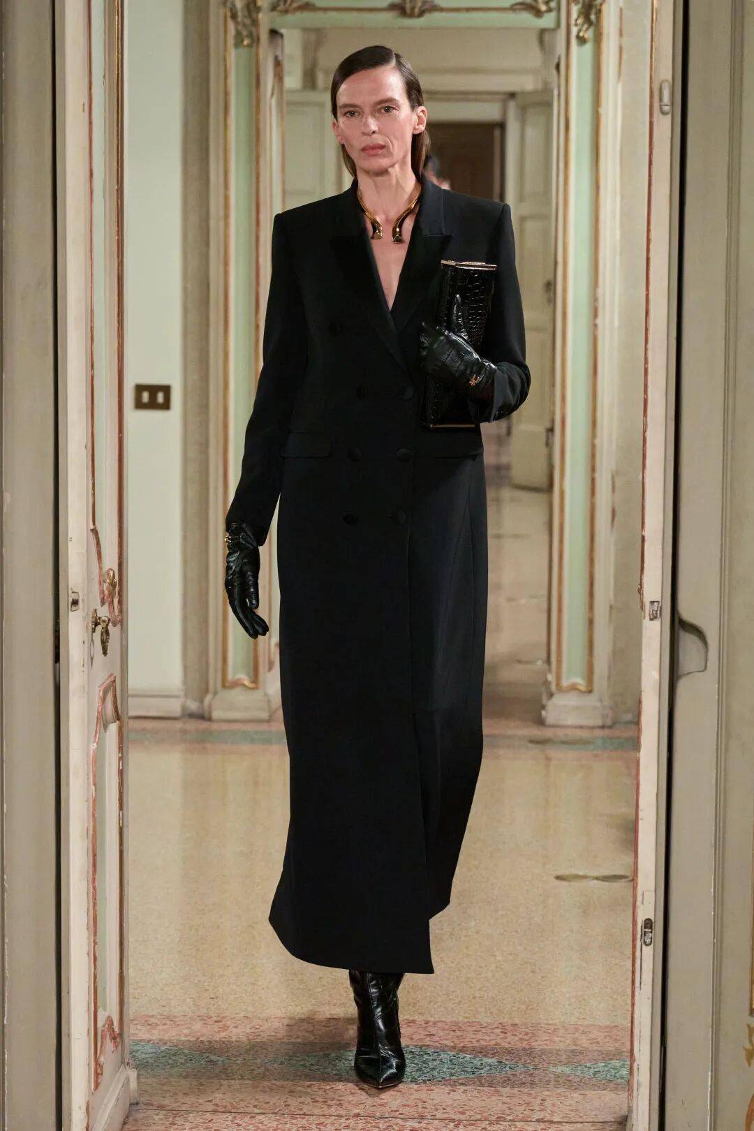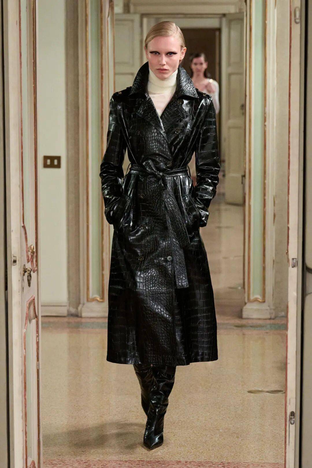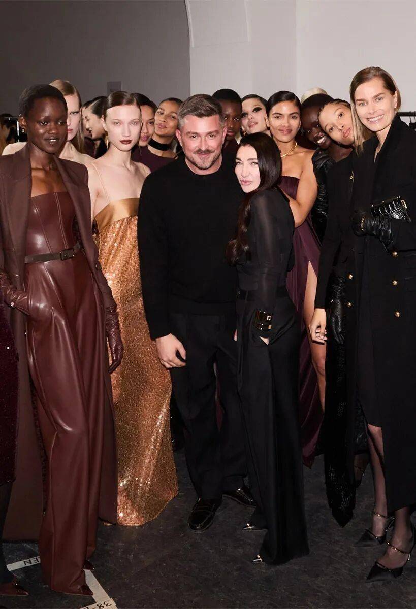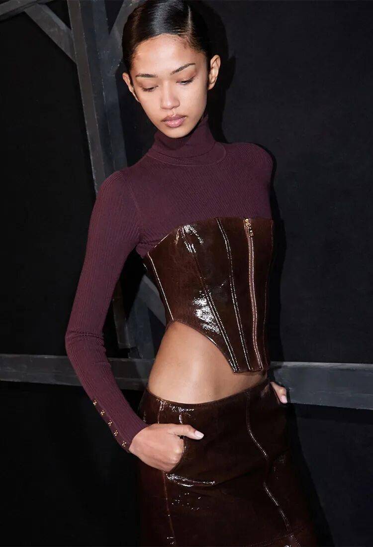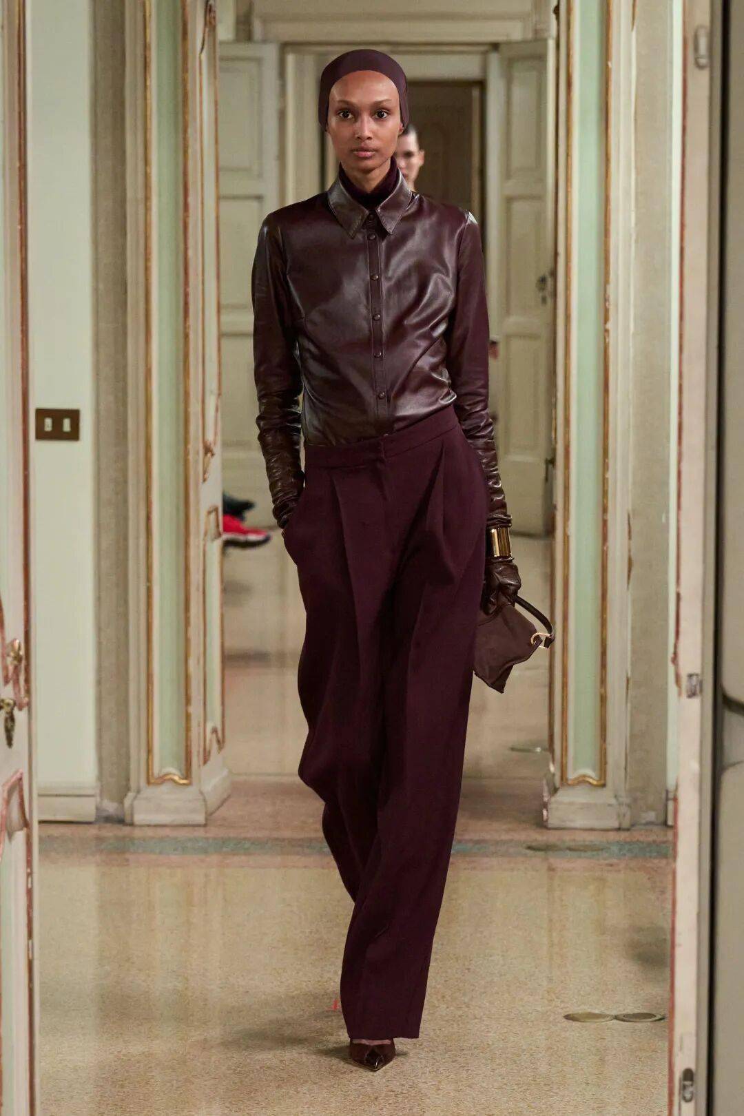 Elisabetta Franchi秋冬系列以深沉黑咖色系为主基调,搭配米白暖棕过渡色,通过酒红色点缀和多材质混搭,展现沉稳优雅与现代力量感的平衡。