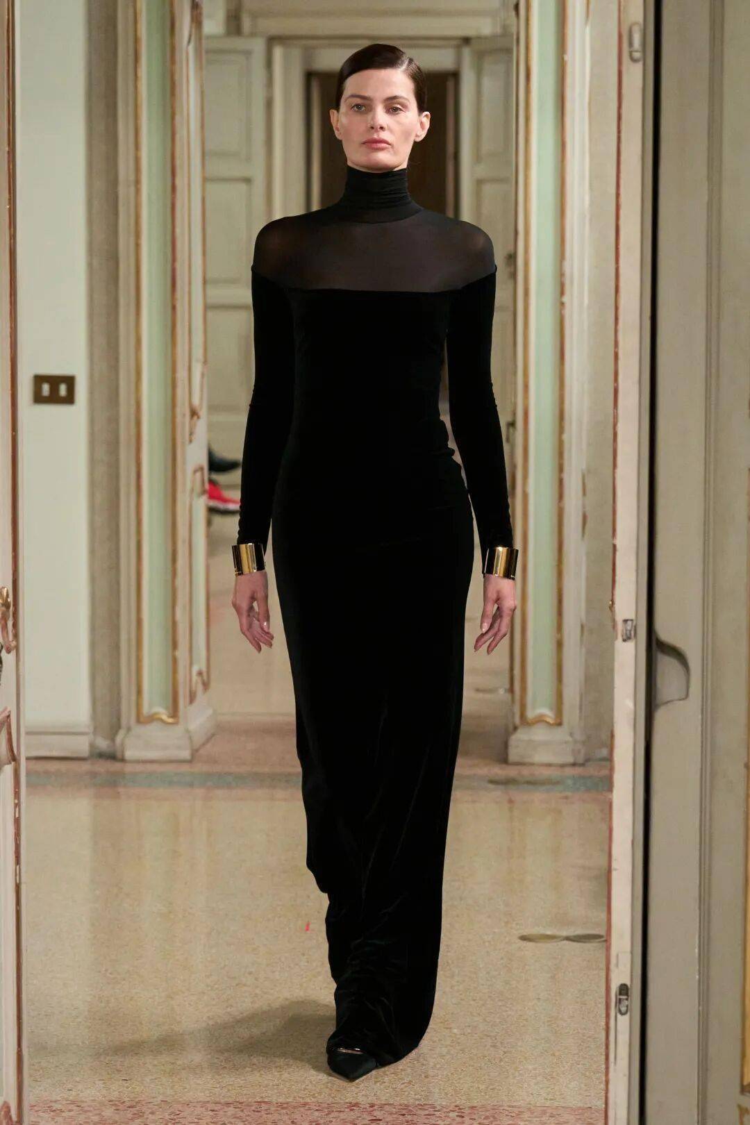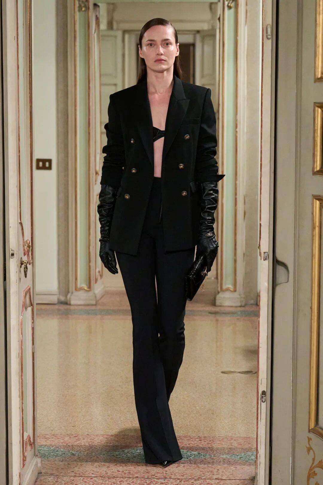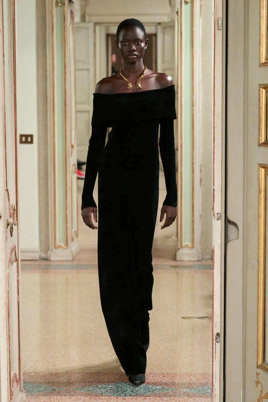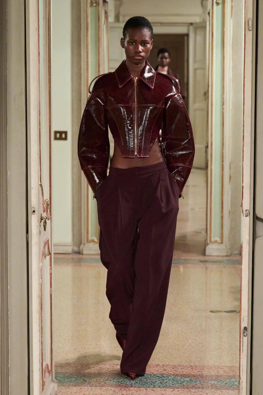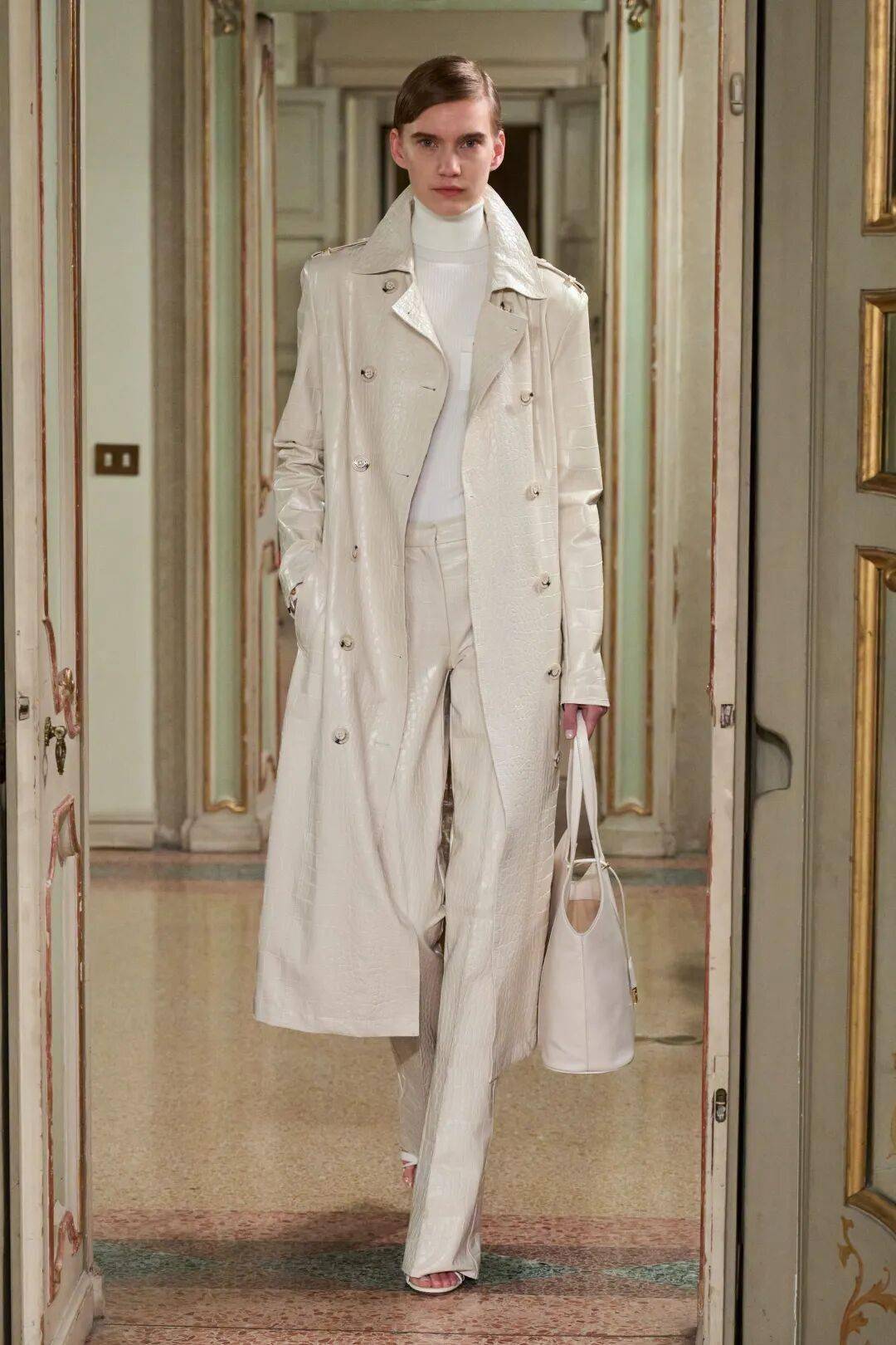 Elisabetta Franchi秋冬系列以深沉黑咖色系为主基调,搭配米白暖棕过渡色,通过酒红色点缀和多材质混搭,展现沉稳优雅与现代力量感的平衡。