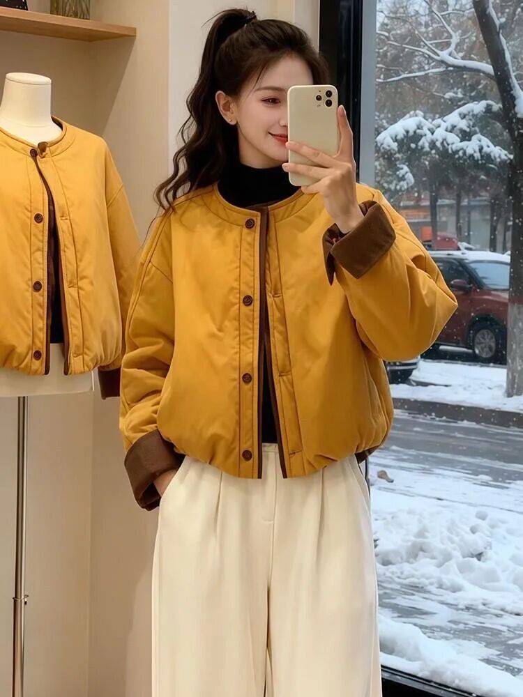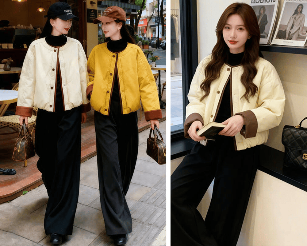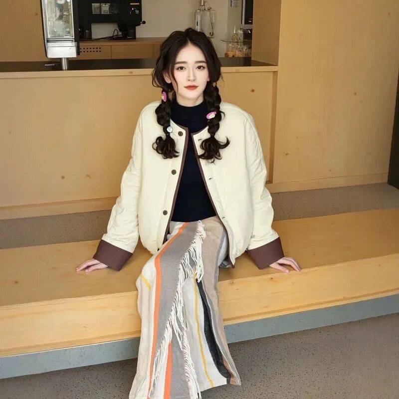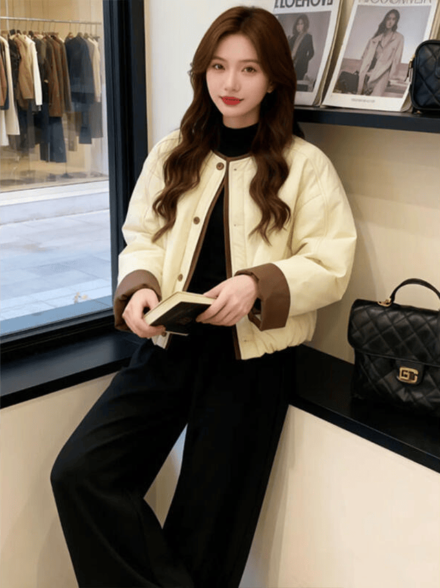✅ 衬衣布的轻薄质感,中和了棉服的蓬松感,视觉上会更轻盈;