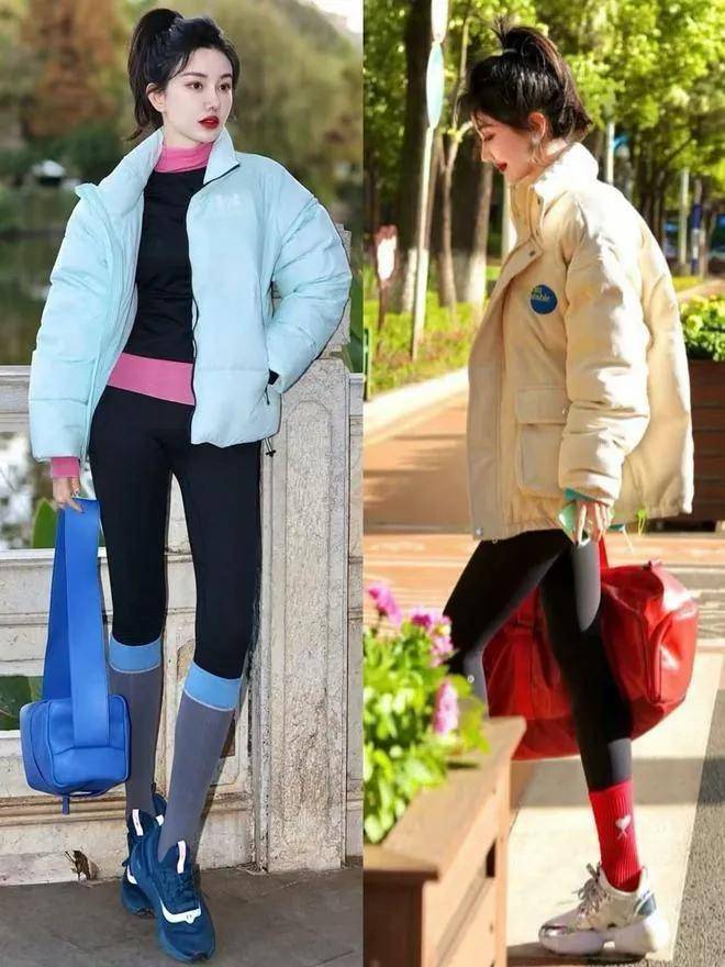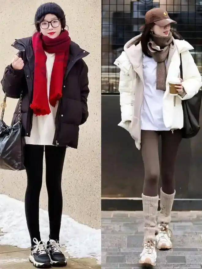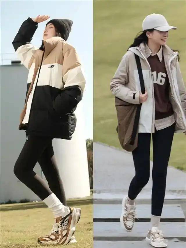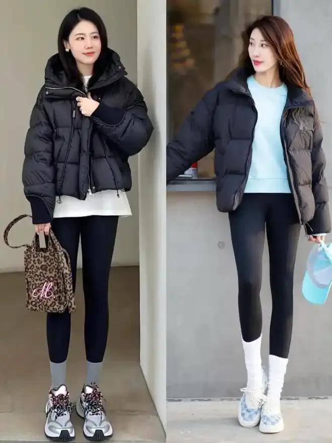 宽松羽绒服搭配弹性打底裤,活动自如又不失时尚感。